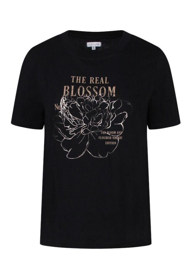 Geef je zomeroutfit een frisse en vrouwelijke twist met dit katoenen T-shirt van Citylife. Het shirt heeft een ronde hals en korte mouwen, en is voorzien van een speelse borstprint met een combinatie van tekst en een glanzende folieprint bloem op het voorpand. De comfortabele pasvorm en zachte kwaliteit maken het een ideaal item voor dagelijks gebruik. Draag ?m casual op een jeans of combineer met een rok voor een meer geklede look.