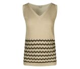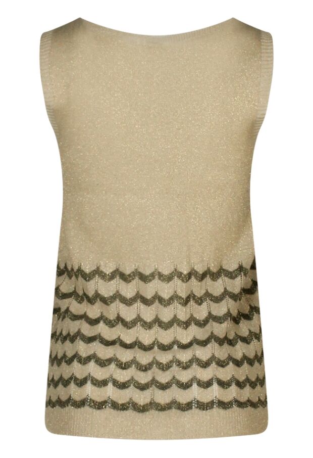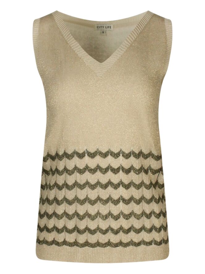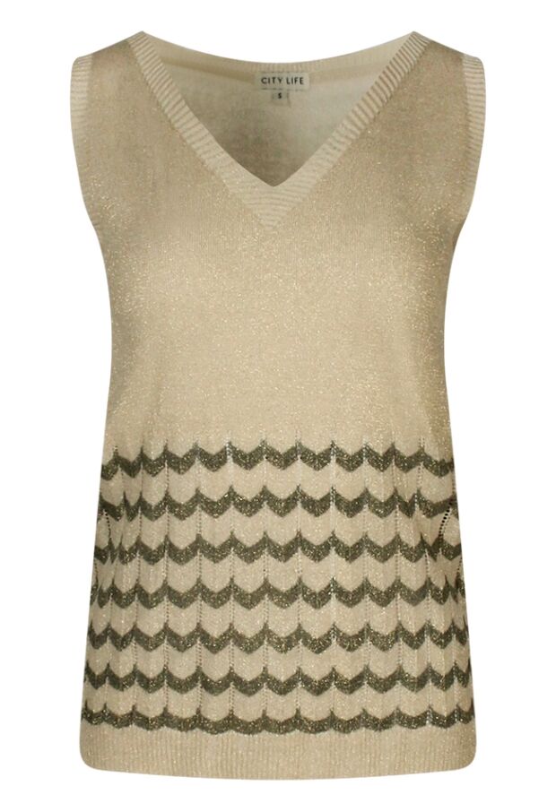 Dit mouwloze singlet van Citylife uit de zomercollectie is een echte eyecatcher dankzij het verfijnde zigzagdessin in lurex fijnbrei. De mix van katoen met metallic garen geeft het topje een subtiele glans en een elegante uitstraling, perfect voor zonnige dagen of een avondje uit. De V-hals zorgt voor een vrouwelijke touch, terwijl het luchtige materiaal comfortabel draagt tijdens warme temperaturen. Stijlvol én zomers: dit singlet is een sprankelende aanvulling op je garderobe.