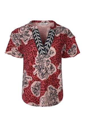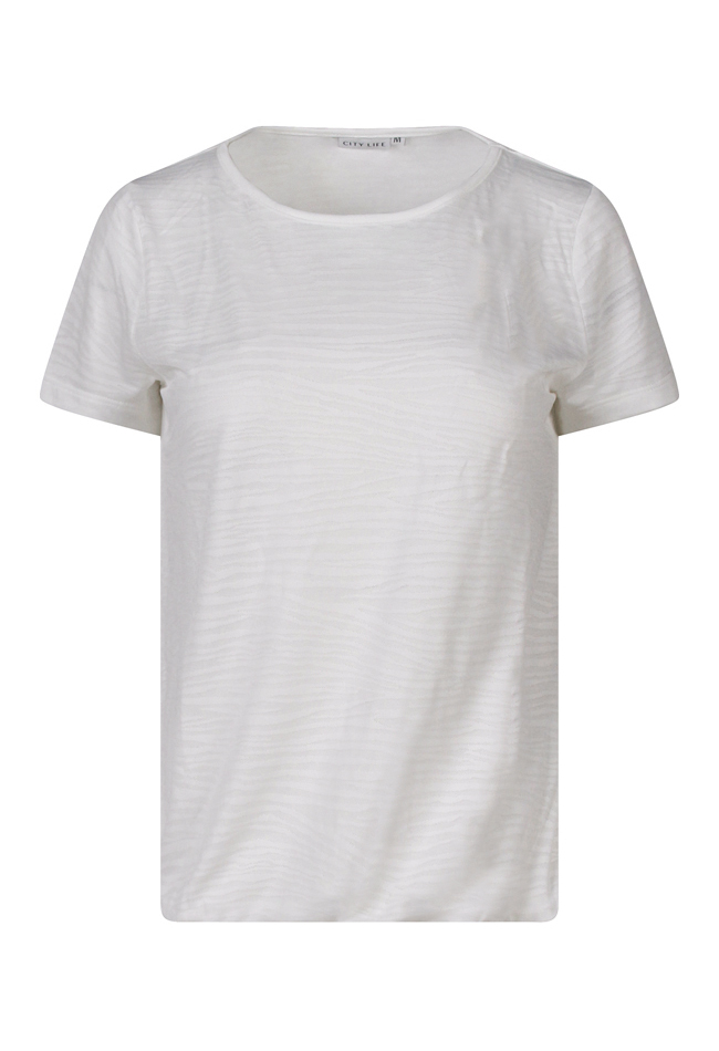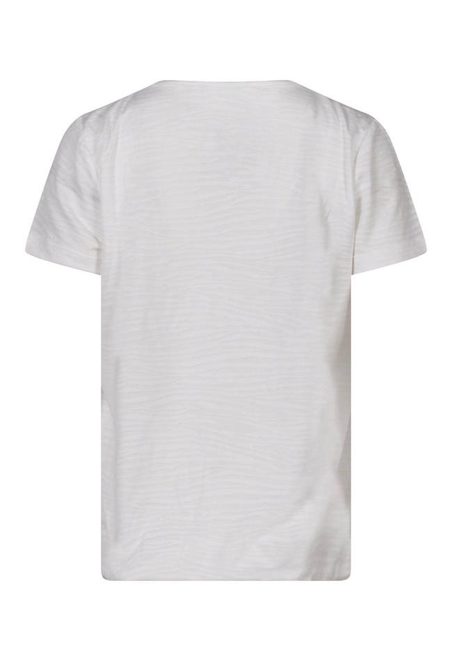 Dit T-shirt is licht doorschijnend door het fijne zebra motief in de stof. Dit shirt kan je in de taille laten bollen omdat er een elastiek in zit. Leuk te dragen onder een blazer maar mag zo gewoon op een rok of broek ook zeker gezien worden!