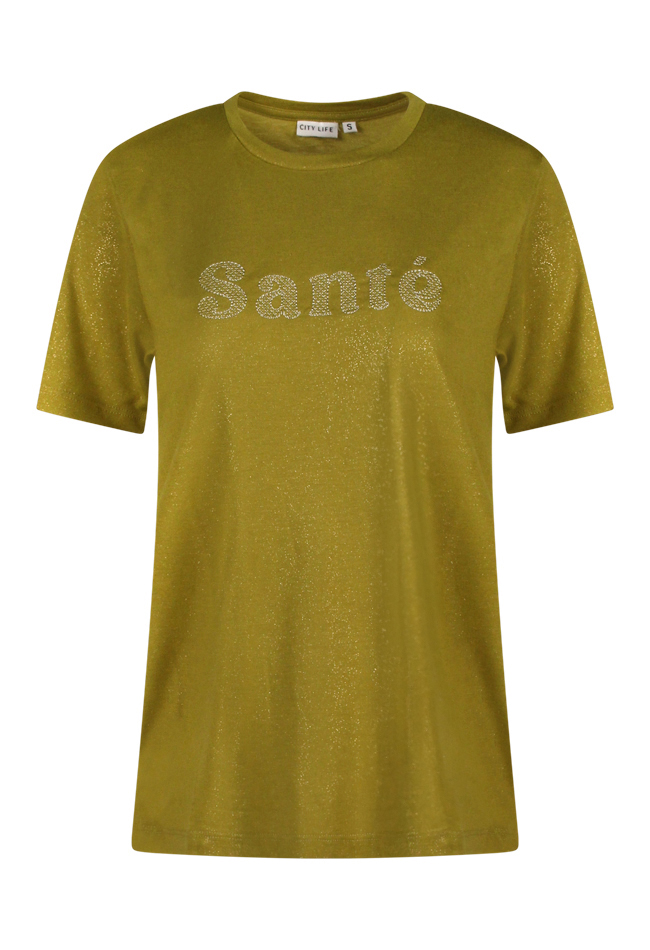 Dit dames t-shirt van City Life is een echte eyecatcher! Het shirt heeft een subtiele glans en is voorzien van de geborduurde tekst "Santé" op de borst. Dankzij de comfortabele pasvorm en zachte stof is het perfect voor zowel een casual als feestelijke look. Combineer het met een jeans of rok voor een stijlvolle outfit met een vleugje glamour.