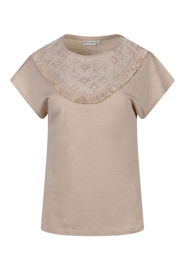 Dit dames t-shirt van City Life is een perfecte mix van comfort en elegantie. De ronde hals is afgewerkt met een prachtig gehaakt patroon en subtiele franjes, wat zorgt voor een speelse en vrouwelijke uitstraling. Het shirt is gemaakt van een comfortabele, soepele stof en is verkrijgbaar in meerdere kleuren. Draag het casual op een jeans of combineer het met een rok voor een meer geklede, stijlvolle look.