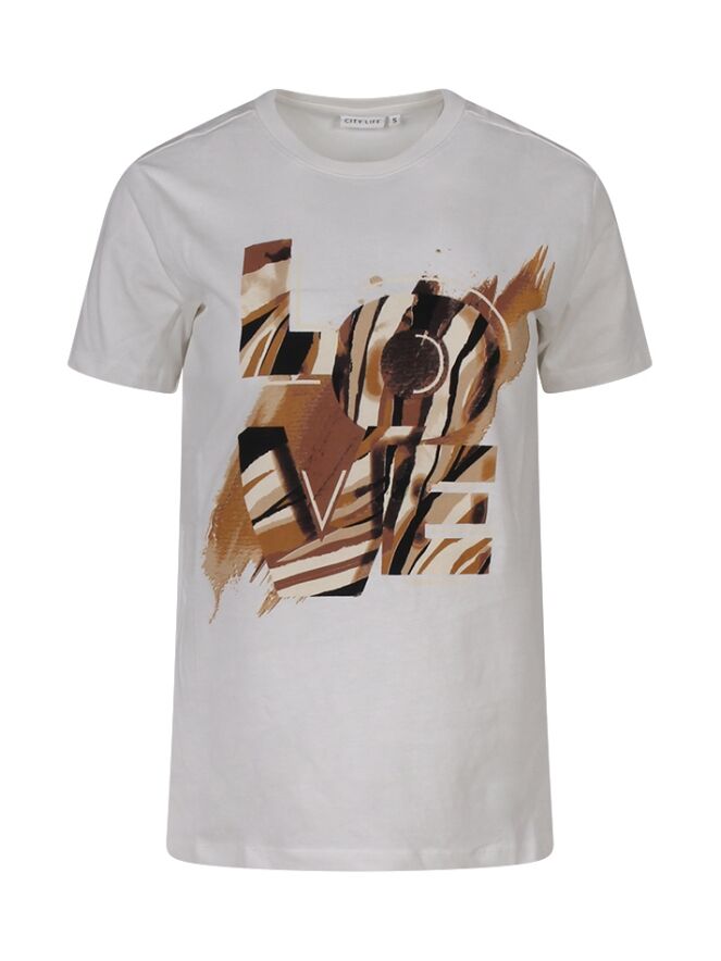 Dit dames t-shirt van City Life is een echte eyecatcher dankzij de grote "LOVE"-print op de voorkant in een mix van aardetinten en abstracte dierenprint. Het shirt is gemaakt van een zachte, comfortabele stof en heeft een klassieke ronde hals en korte mouwen. Perfect om te combineren met een jeans of short voor een casual en stijlvolle look met een opvallend accent.