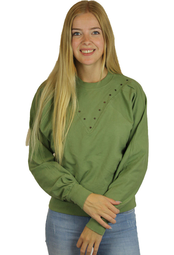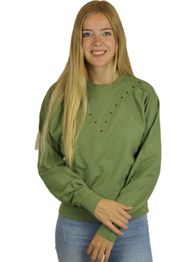 Trui van CL Essentials. De trui heeft een v pas met studs. De heeft plooien op de mouwen. Valt ruim op maat. Materiaal: 95% katoen, 5% elasthan. Wassen op 30 graden, niet bleken, niet in de droger, kan gestreken worden.