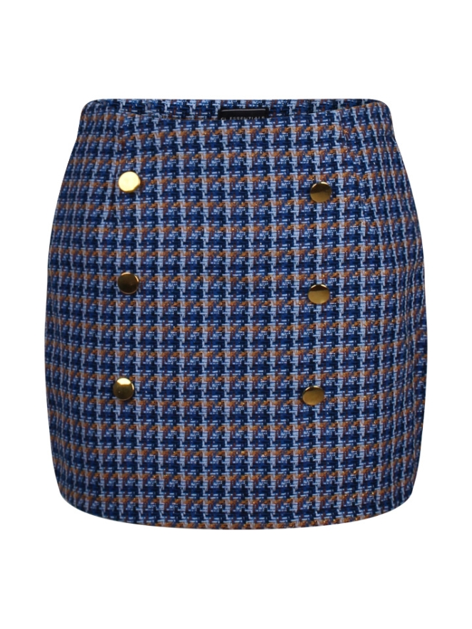 Geruit rokje gemaakt van tweed stof. Op het voorpand zitten twee rijen van 3 gouden sierknopen en een stoere speld met kettingen. De tailleband is voorzien van rits aan de achterkant.