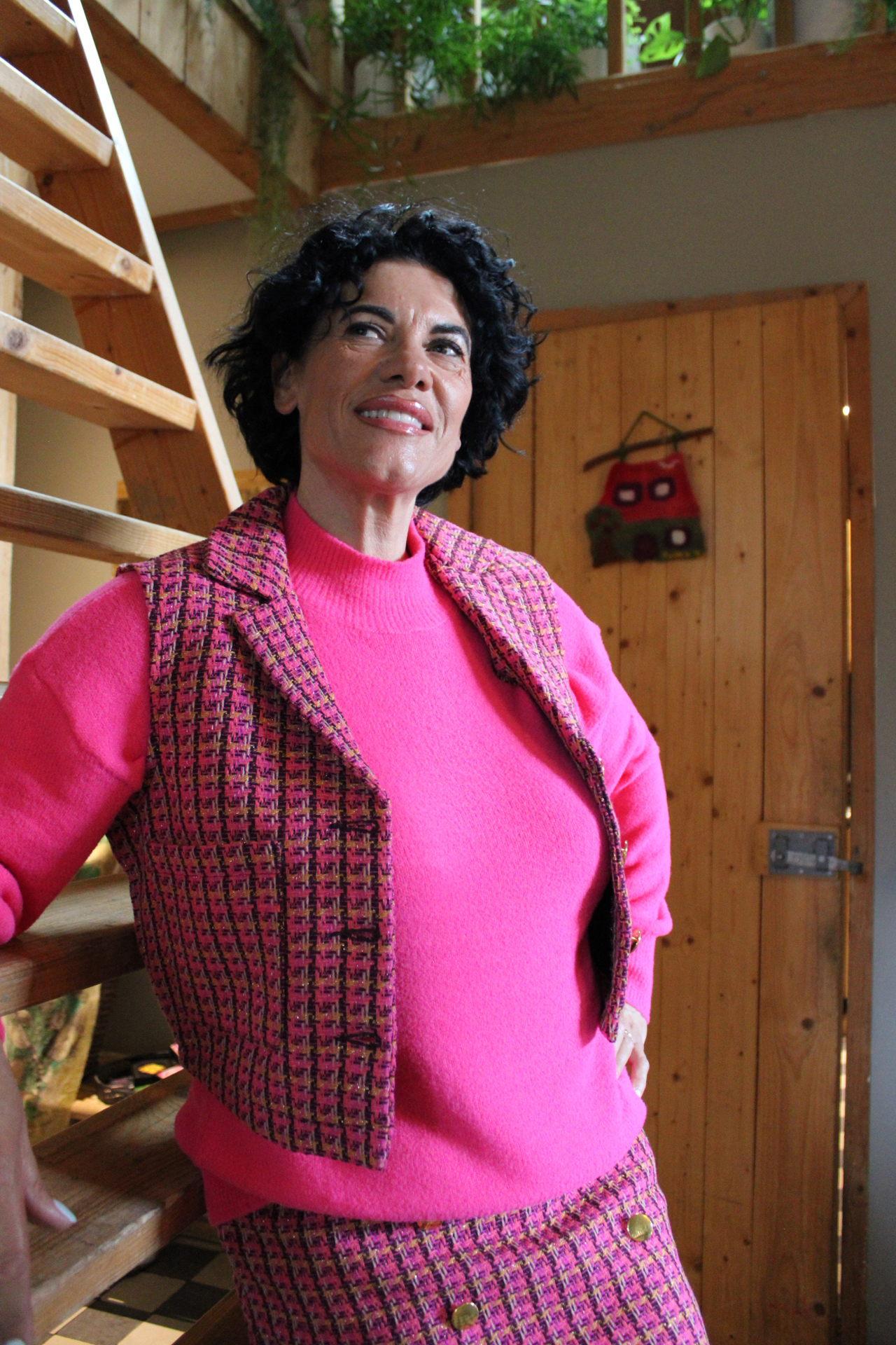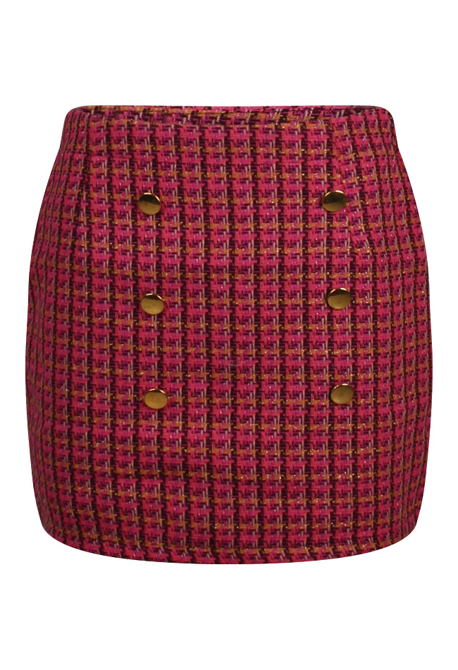 Geruit rokje gemaakt van tweed stof. Op het voorpand zitten twee rijen van 3 gouden sierknopen en een stoere speld met kettingen. De tailleband is voorzien van rits aan de achterkant.