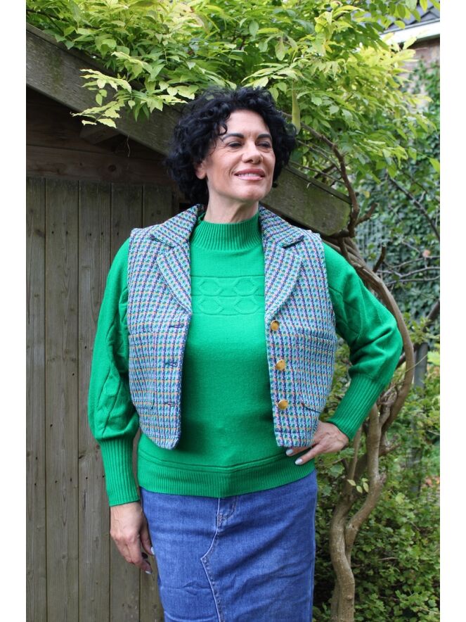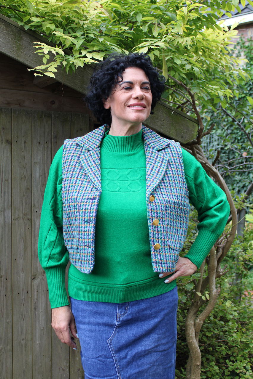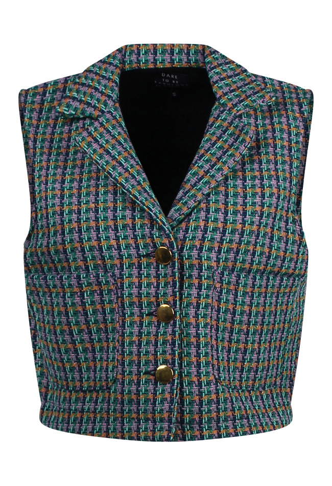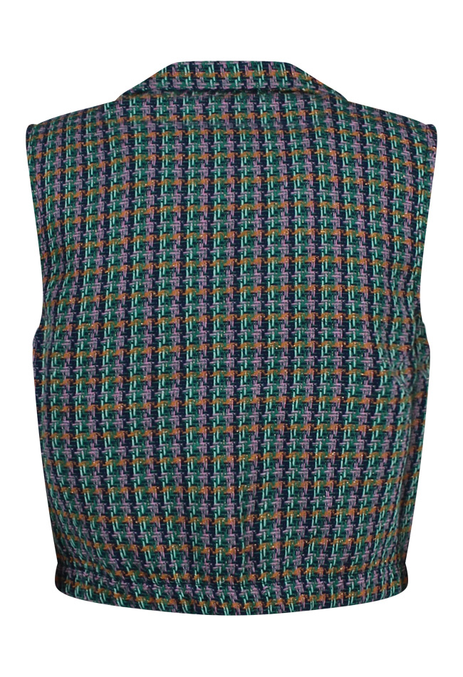 Geruit gilet gemaakt van een tweed stof met een revers kraag. Dit gilet sluit aan de voorkant met drie grote gouden knopen. Op het voorpand zitten twee opgestikte zakken.
