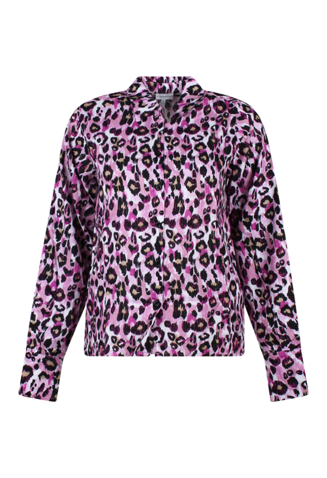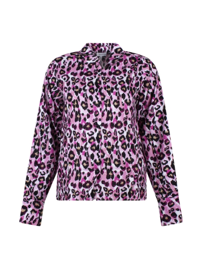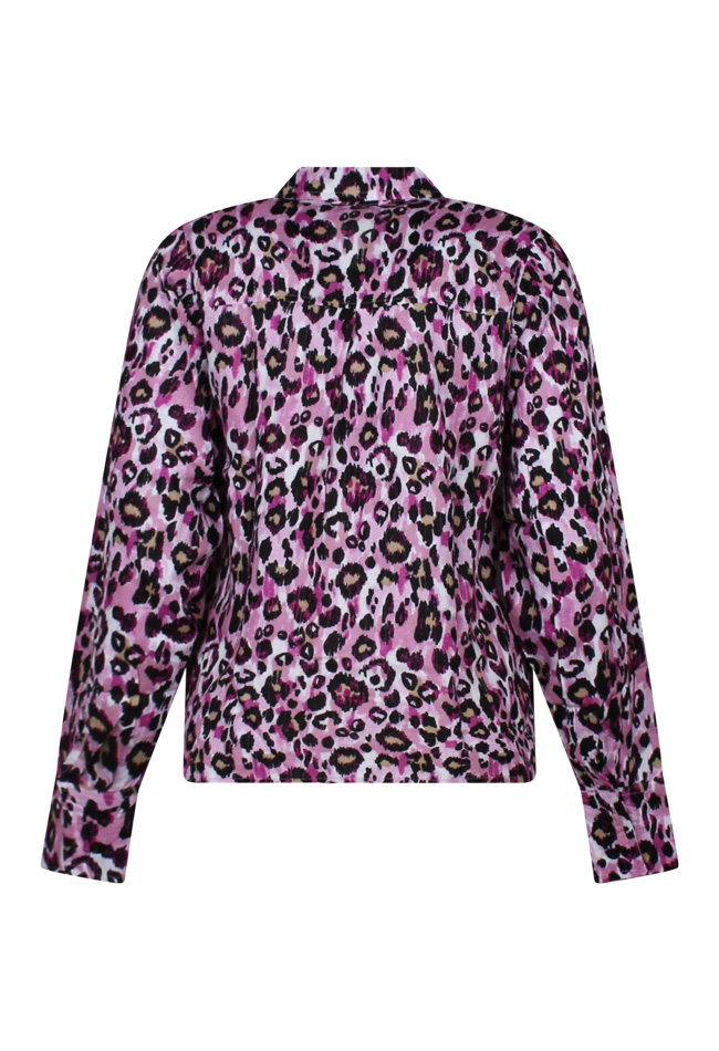 Blouse met panterprint en ingeweven lurex draad. De blouse heeft een kraagje en wordt aan de voorkant gesloten met knopen. De mouwen zijn voorzien van manchetten met twee knoopjes. De blouse heeft een recht model en wijde mouwen.