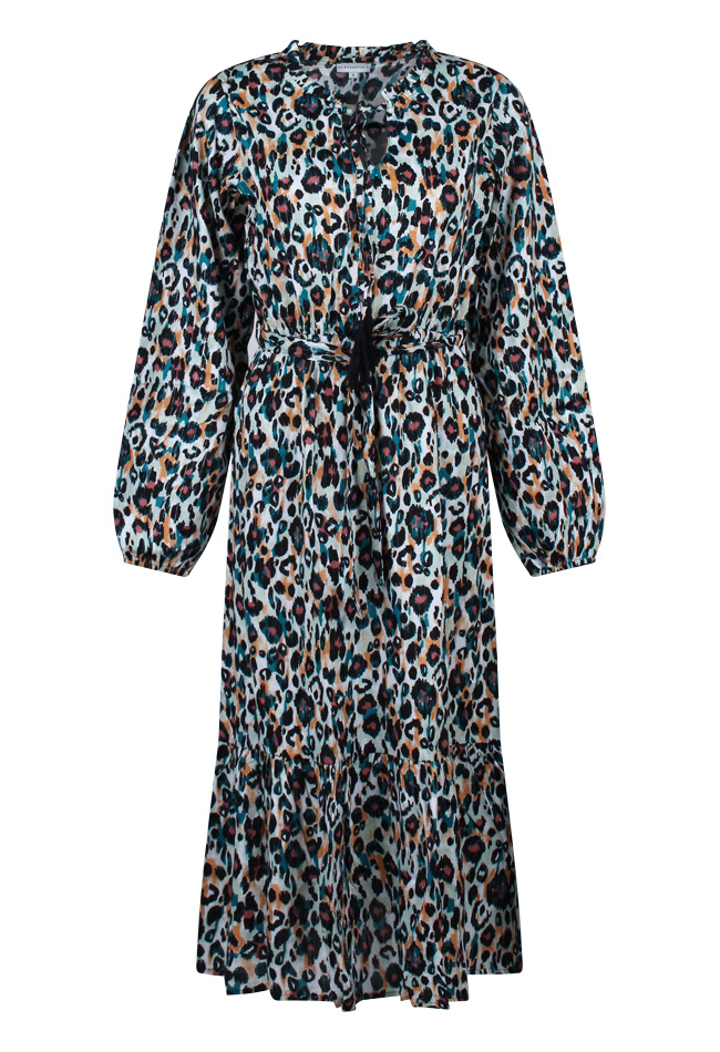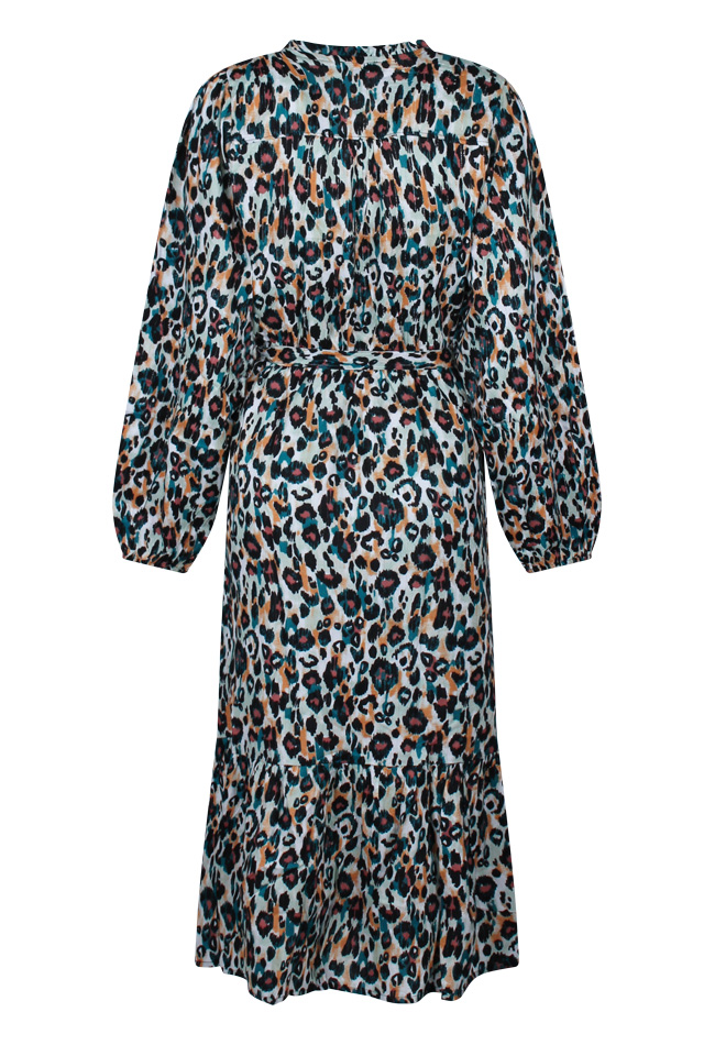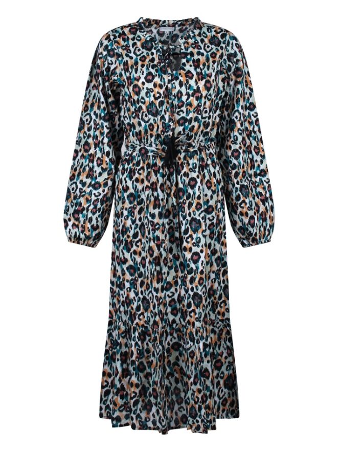 Lange jurk met een all-over panter print en mee geweven lurex draad. De jurk is voorzien van een ronde hals met ruches, een koordje en een V-detail. Verder heeft de jurk pofmouwen met elastische boord, een elastische taille met ceintuur en een brede gerimpelde strook aan de onderkant.