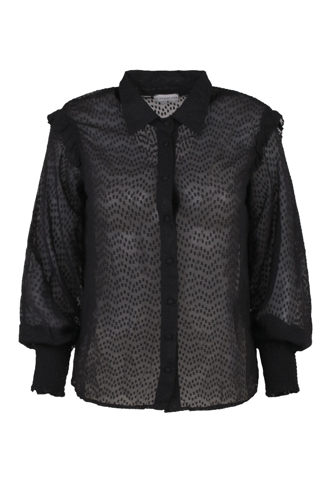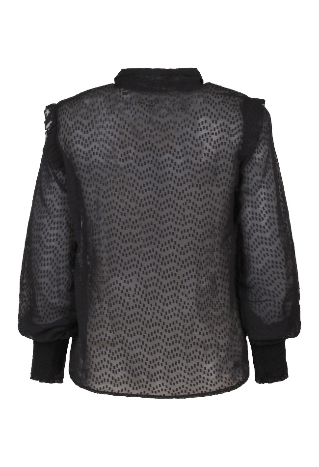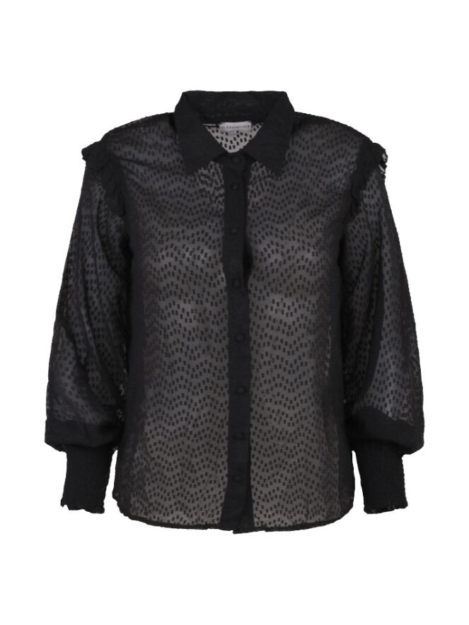 Licht transparante blouse gemaakt van dobber chiffon stof met een kraagje en sierlijke roezels op de mouwkop. De manchetten zijn gemaakt van smockwerk. De voorkant word gesloten met gestoffeerde knoopjes.
