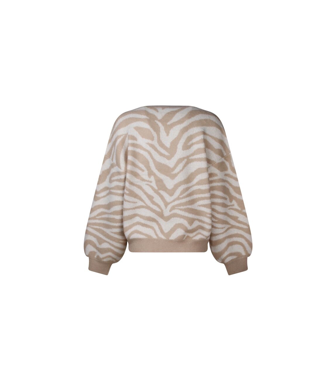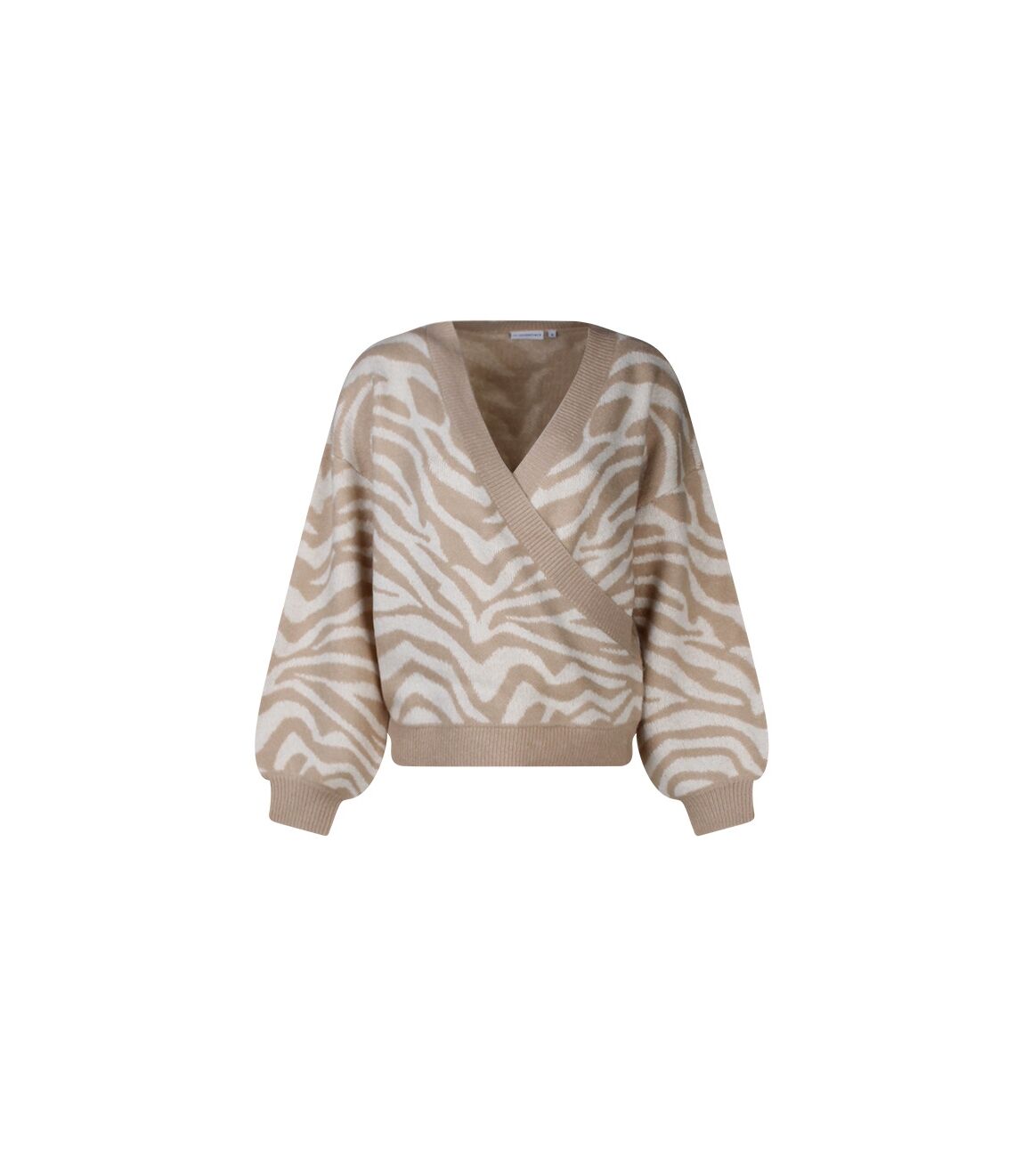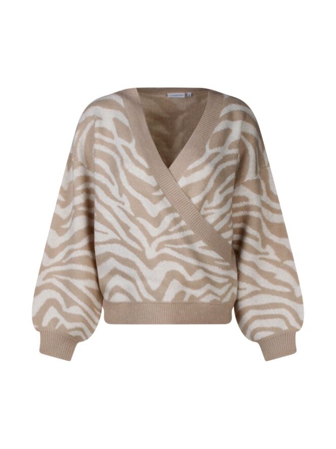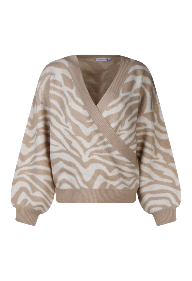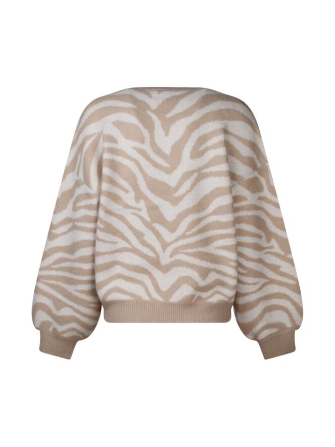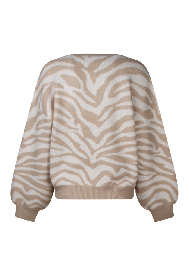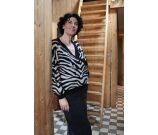Deze trui met allover zebraprint is een ruimvallen model en heeft aan de voorkant een overslag waardoor een V hals ontstaat.