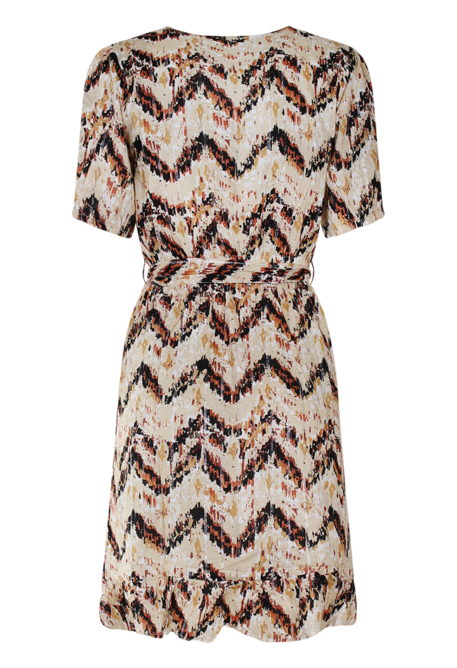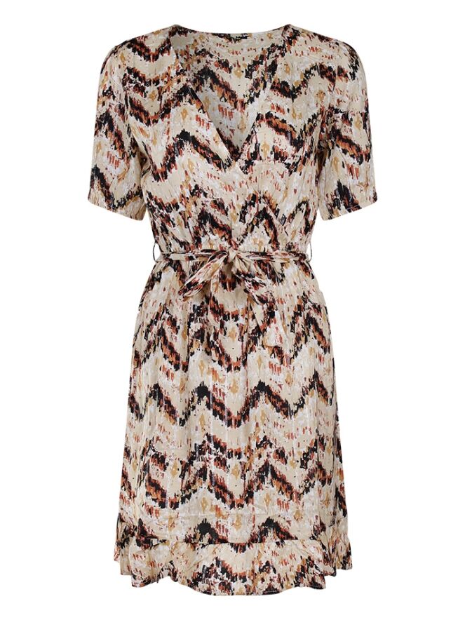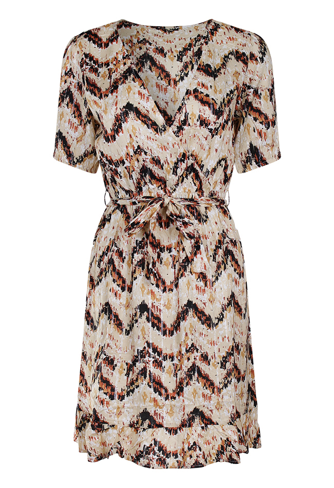 Jurk met korte mouwen een allover ikat print en een overslag hals. De elastische tailleband heeft een strikceintuur.