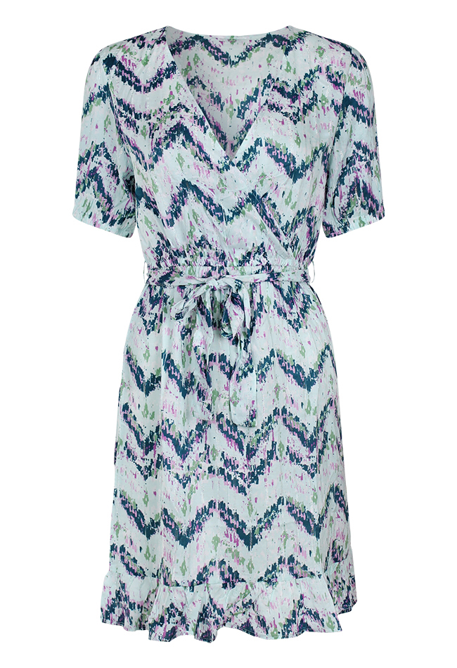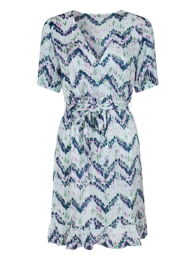 Jurk met korte mouwen een allover ikat print en een overslag hals. De elastische tailleband heeft een strikceintuur.