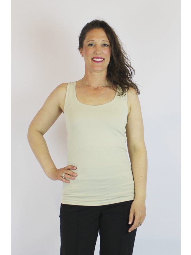 Dit hemd is mouwloos en heeft een aansluitend model. De bovenkant van het singlet is dubbel en is verkrijgbaar in zes verschillende kleuren.