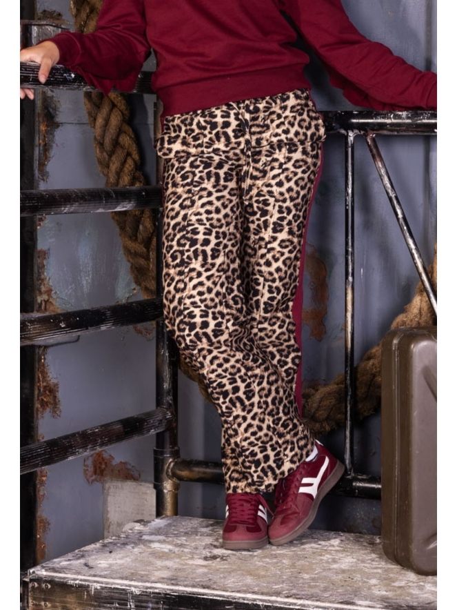 Sportieve panter pantalon met trendy bordeaux streep aan de zijkant van het been. Ook heeft deze comfortabele broek fijne steekzakken, een opnaadje voor over het been en een elastische tailleband zodat hij aanvoelt als een joggingbroek. Deze trek je niet meer uit!