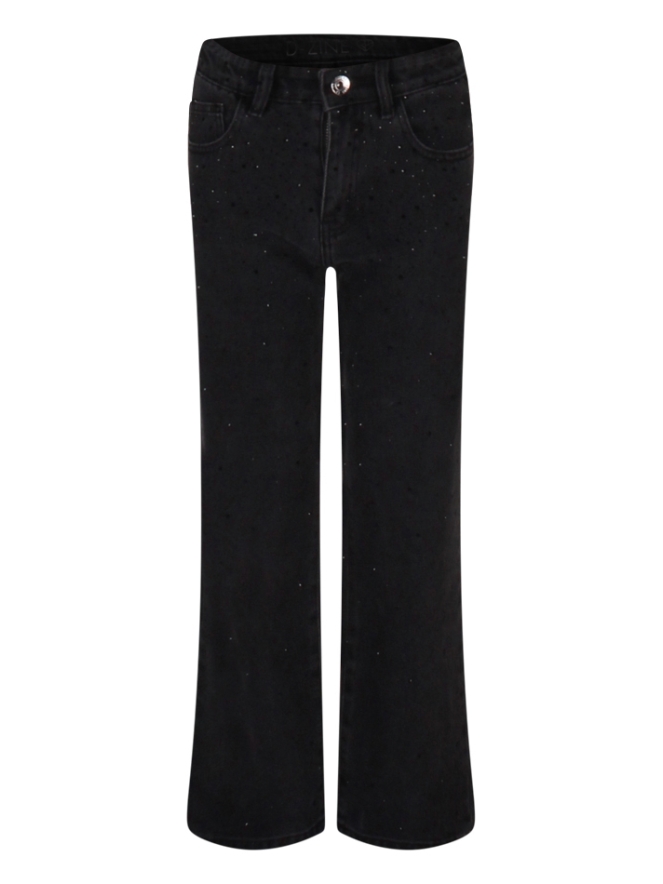 Prachtige zwarte jeans met zwarte strass stenen. Deze broek heeft een rechte pijp en is een regular fit. Verstelbaar in de taille met knoop en elastiek. Let op, deze broek heeft geen stretch en is echt een oerdegelijke spijkerbroek met een vleugje bling bling.