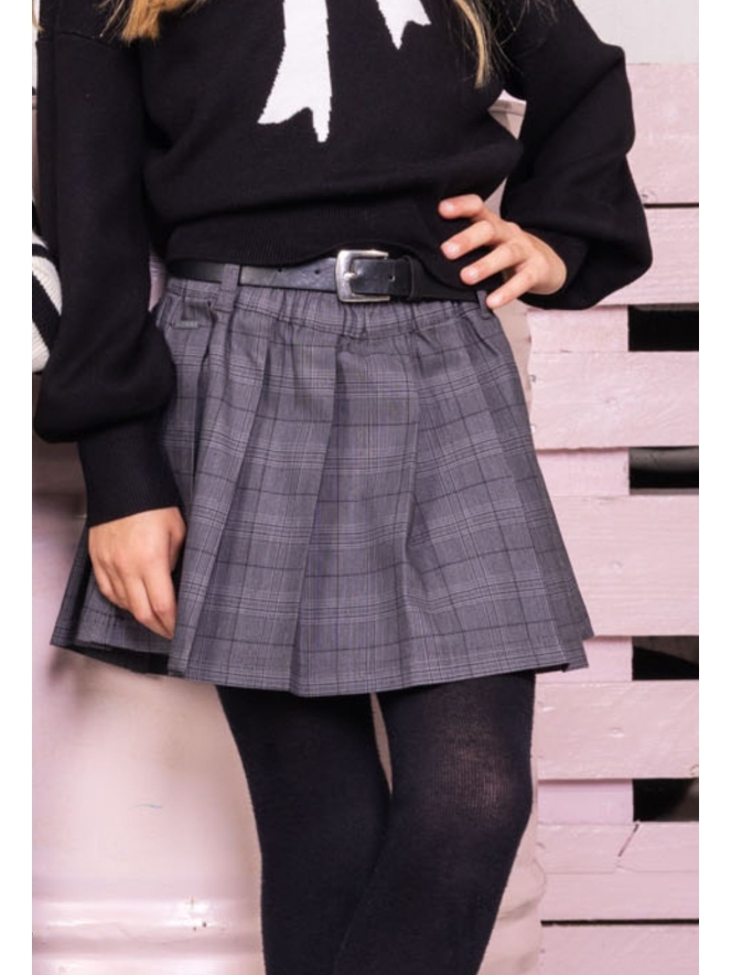 High school look-a-like plooirokje van een mooie geruite stof met een zwarte kunstof riem. Leuk te combineren met sweaters en truien. Zwarte legging eronder met een leuk laarsje en je heb een leuke college look!
