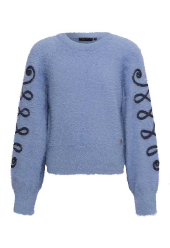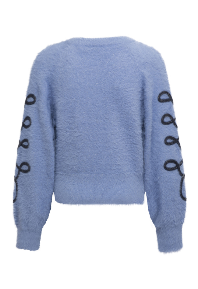 Deze meisjes sweater van featheryarn met subtiele lurex glinstering voelt heerlijk zacht aan en straalt echte glamour uit. De mouwen zijn afgewerkt met een opgestikt lint voor een trendy detail met een stoer randje. Perfect voor meiden die houden van comfy en stijlvol. Combineer met een jeans, rokje of flared pants voor een look die opvalt!