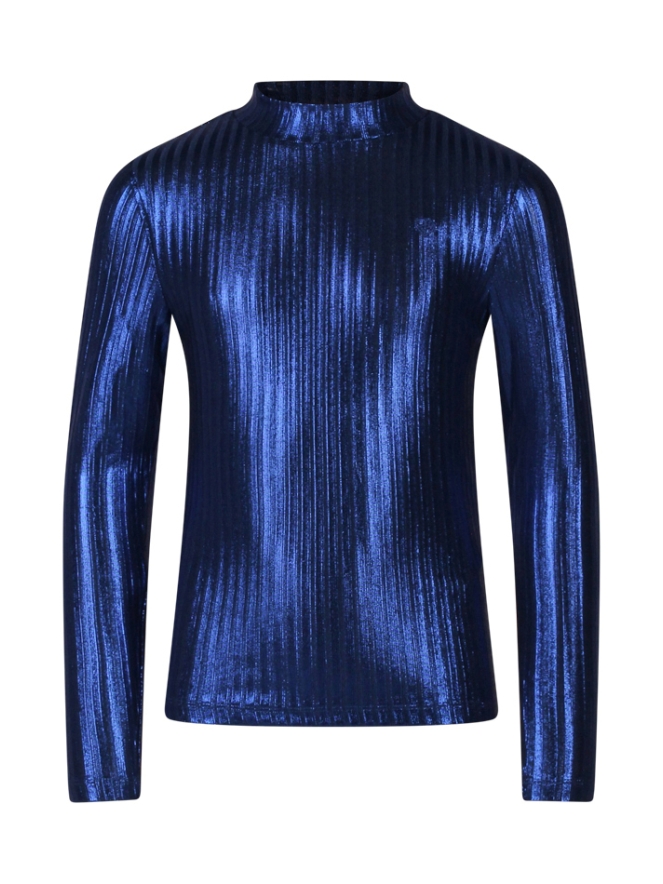 Trendy meisjes t-shirt met een turtleneck. Gemaakt van comfortabele polyester/elastan ribstof en voorzien van een metallic coating voor een feestelijke uitstraling. Het aangesloten model is perfect voor zowel alledaagse looks als speciale gelegenheden.