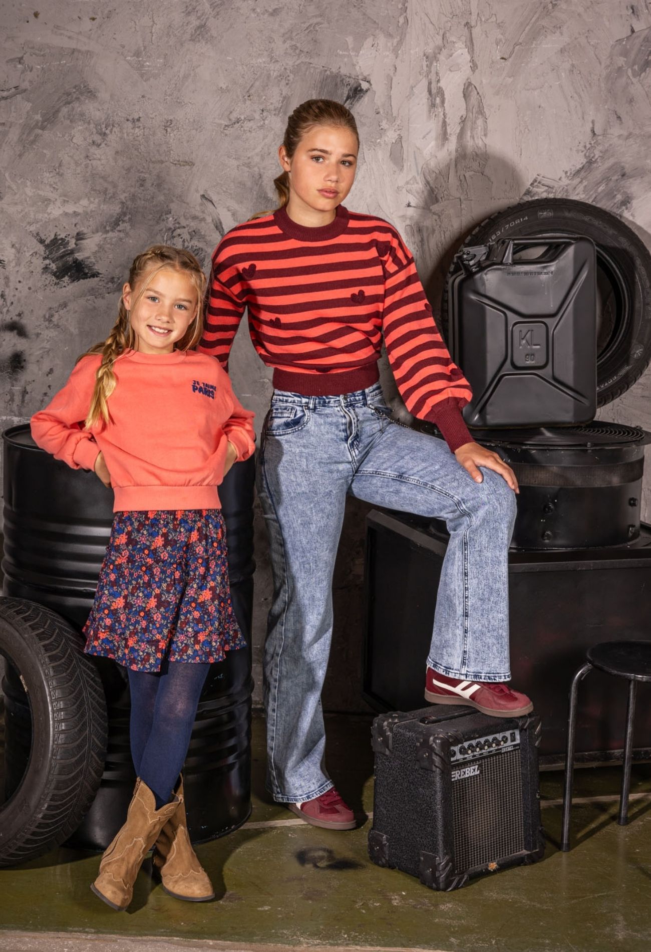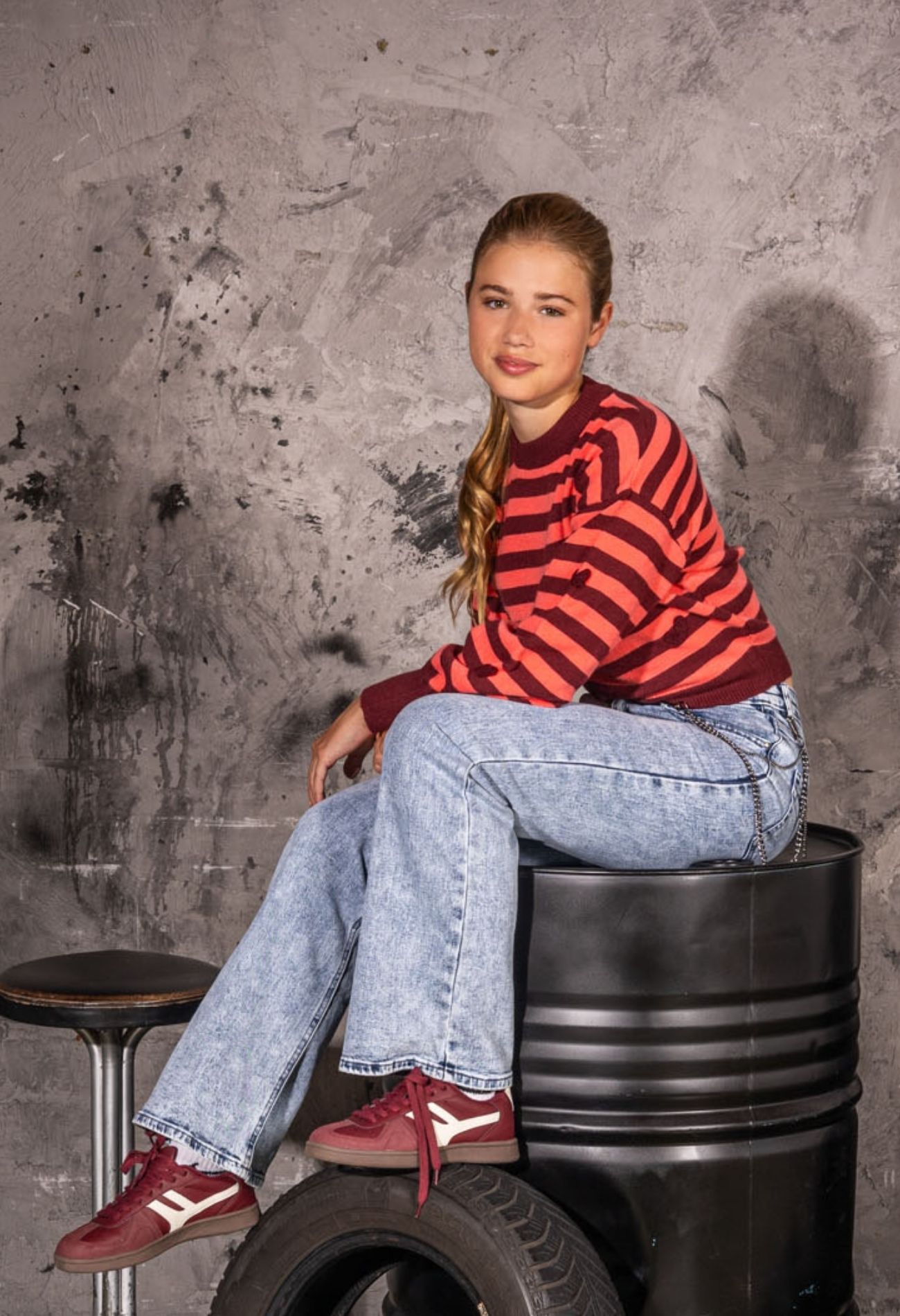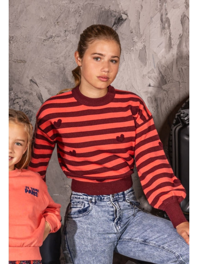 Warme trui voor je meisje? Dat is deze gebreide trui combineert een klassiek streepmotief met lieve hartjes van teddy stof voor een speelse en tijdloze look. Perfect voor de koudere dagen, gemaakt van zacht materiaal dat heerlijk draagt. Draag ?m met een jeans of een rok voor een schattige en comfortabele outfit.