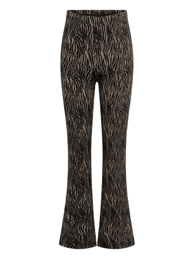 Trendy meisjes flair broek van D-zine, uitgevoerd in een comfortabele polyester/elastaan ribkwaliteit. De ene broek heeft een panter print, de andere broek een zebra print. De broek heeft een aansluitende pasvorm aan de bovenkant en loopt wijd uit in een flairmodel. Dankzij de elastische tailleband sluit de broek mooi aan en draagt hij extra comfortabel. De broek is te combineren met een bijpassende top in dezelfde print.