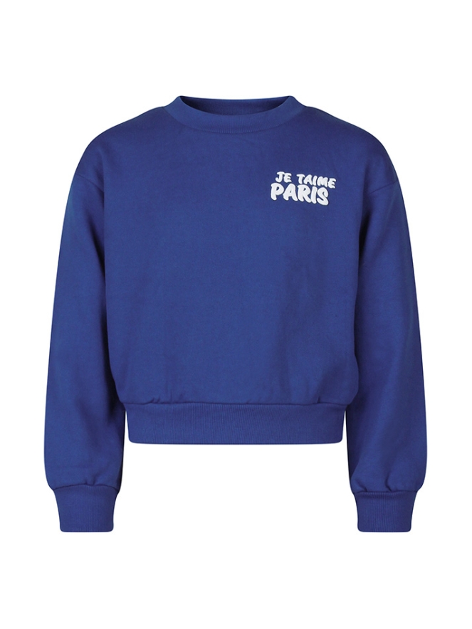 Je taime Paris! Deze gave sweater in frisse kleur heeft een kleine tekstprint voorop en een grote achterop. Leuk in combinatie met een vrolijk rokje maar doet het ook erg leuk op een gewone spijkerbroek! Hip en trendy en lekker casual!