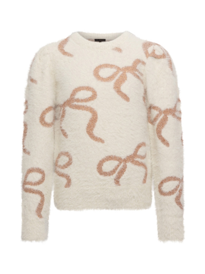 Deze meisjestrui is gemaakt van zachte featheryarn en heeft een speels all-over strikdessin. In de strikken is een subtiel lurexdraadje verwerkt, wat zorgt voor een feestelijke sparkle zonder te overdrijven. De rest van de trui is heerlijk zacht en comfortabel. Perfect te combineren met een rokje voor een girly look of met een jeans voor een fijne, casual outfit.