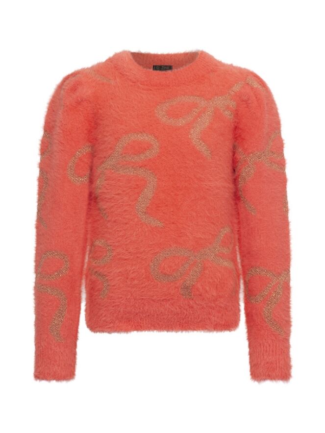 Deze meisjestrui is gemaakt van zachte featheryarn en heeft een speels all-over strikdessin. In de strikken is een subtiel lurexdraadje verwerkt, wat zorgt voor een feestelijke sparkle zonder te overdrijven. De rest van de trui is heerlijk zacht en comfortabel. Perfect te combineren met een rokje voor een girly look of met een jeans voor een fijne, casual outfit.