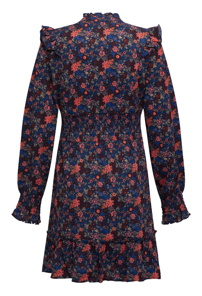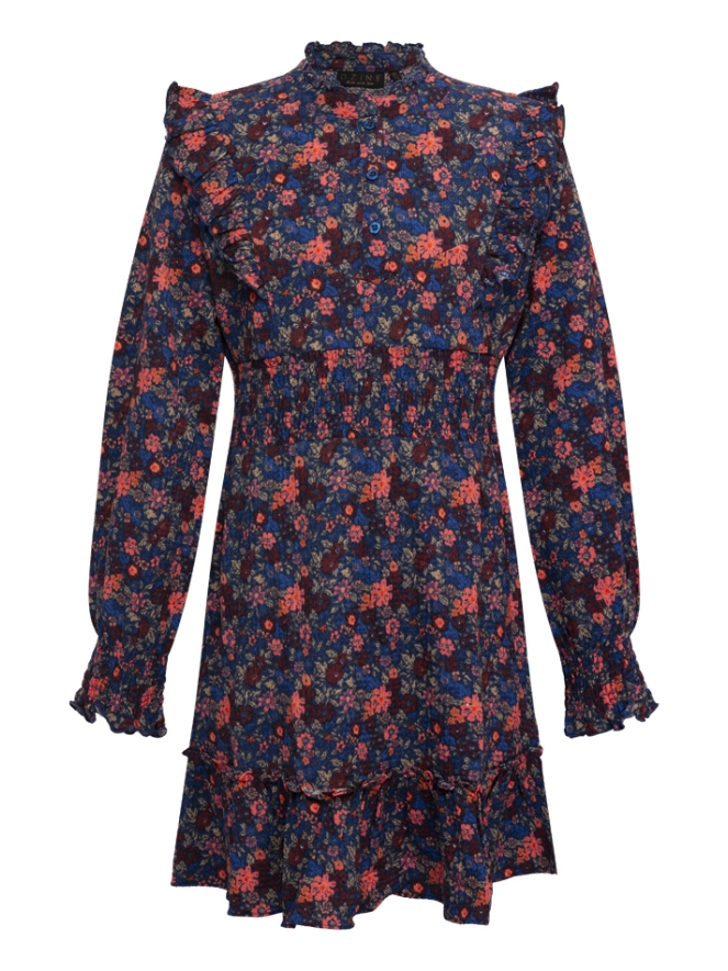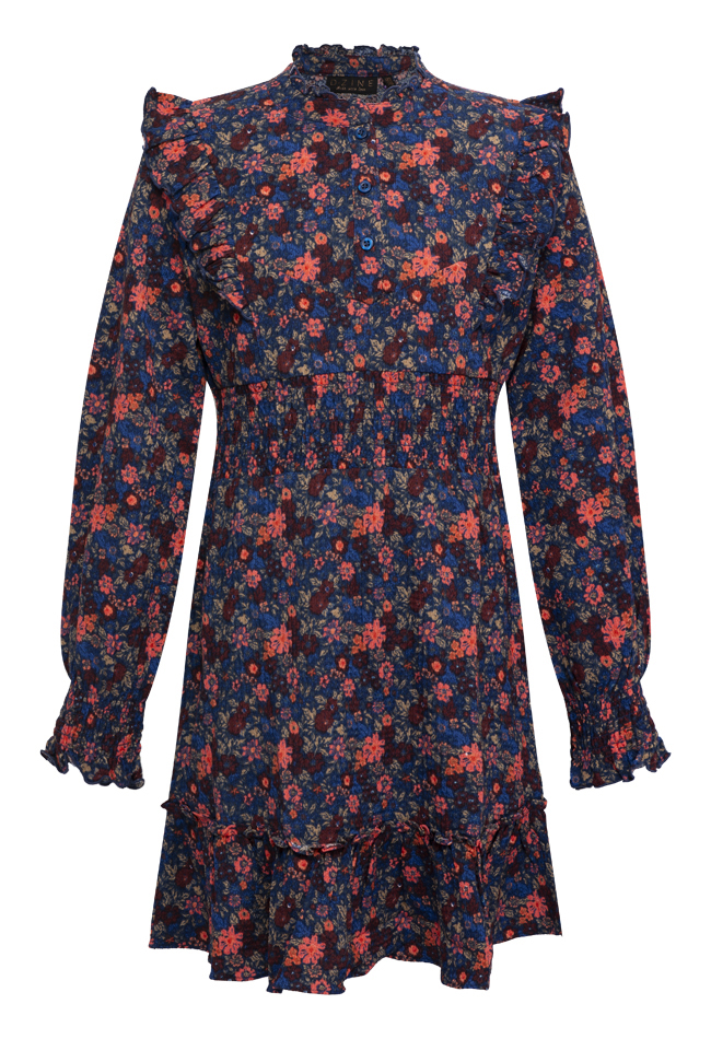 Stijlvolle meisjes jurk van D-zine, uitgevoerd in een soepele polyester/elastaan crêpe kwaliteit. De jurk is verkrijgbaar in drie varianten: panterprint, zebraprint en bloemenprint. Het model heeft een smockdetail rond de taille en bij de mouwen, waardoor de jurk mooi aansluit en comfortabel draagt. De speelse ruches over de borst en schouders geven de jurk een vrolijke uitstraling, terwijl de ruche rand onderaan de rok zorgt voor een zwierig effect. Een eigentijds item dat zowel stoer als girly gecombineerd kan worden.