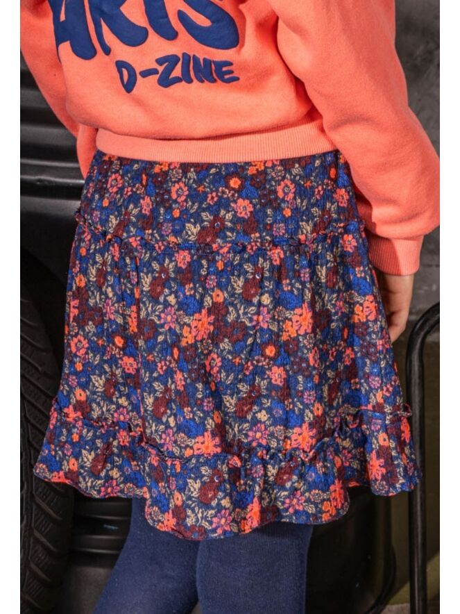 Trendy meisjes rok van D-zine, uitgevoerd in een soepele polyester/elastaan crêpe kwaliteit. De rok heeft een strokenmodel dat zorgt voor een zwierig effect en een elastische tailleband waardoor hij comfortabel draagt. Verkrijgbaar in drie varianten: panterprint, zebraprint en bloemenprint. Perfect te combineren met een eenvoudige top met gilet of met een bijpassend item uit de collectie.