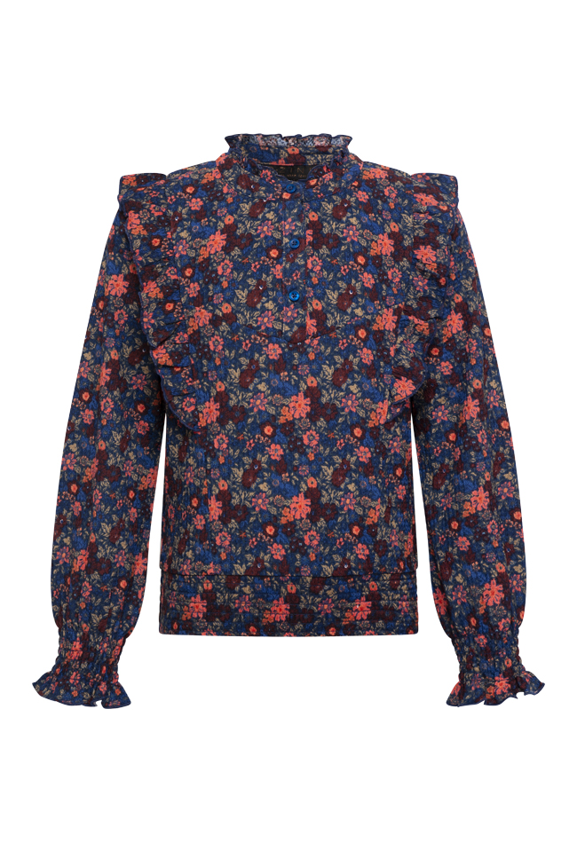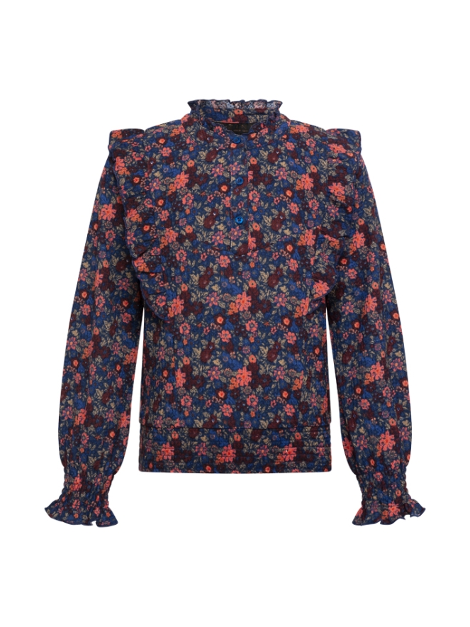 Stijlvolle meisjes blouse van D-zine, uitgevoerd in een soepele polyester/elastaan crêpe kwaliteit. De jurk is verkrijgbaar in drie varianten: panterprint, zebraprint en bloemenprint. Het model heeft een smockdetail bij de boorden. De speelse ruches over de borst en schouders geven de blouse een vrolijke uitstraling. Een eigentijds item dat zowel stoer als girly gecombineerd kan worden.