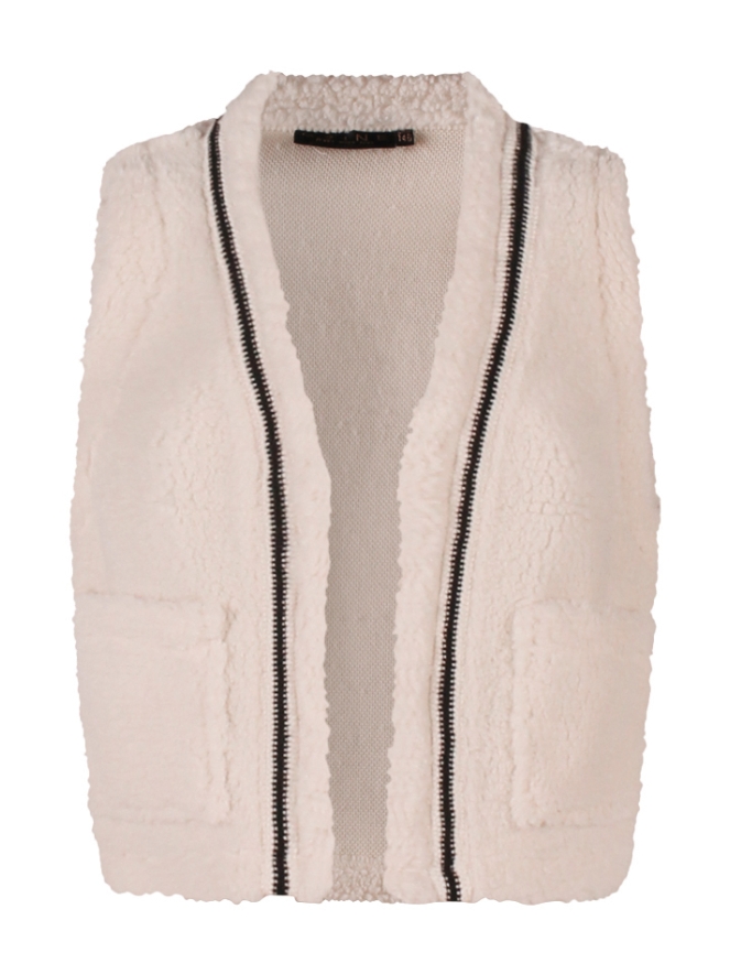 Dit teddy gilet is echt te leuk! De fluffy stof voelt heerlijk zacht aan en geeft elke outfit meteen een cozy touch. De fancy tape details zorgen voor een trendy twist, en de zakjes aan de voorkant maken hem extra handig. Perfect om over een jurkje of longsleeve te dragen, dit gilet maakt elke look af!