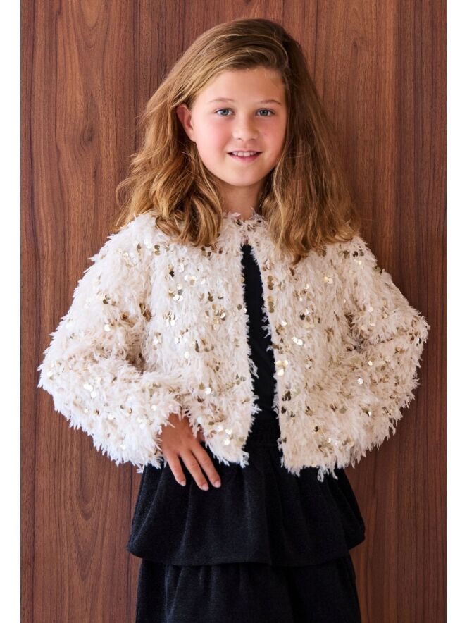 Dit feestelijke vestje voor meisjes is gemaakt van een zachte featherlook stof met glinsterende sequins voor een extra sprankelend effect. Het vestje heeft een openvallend model en voelt licht en comfortabel aan. Perfect om over een jurk of top te dragen voor een feestelijke gelegenheid.