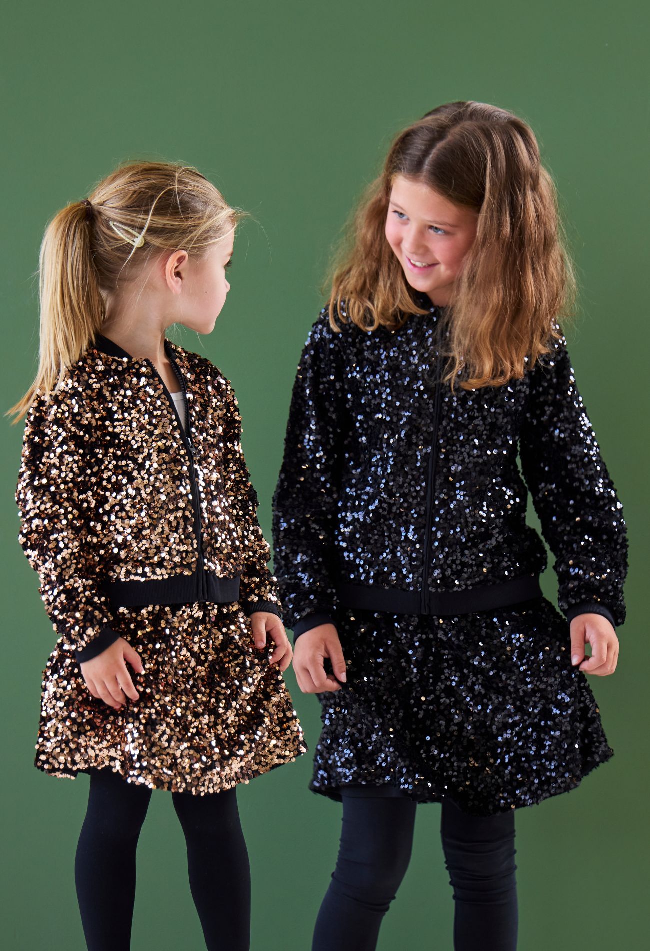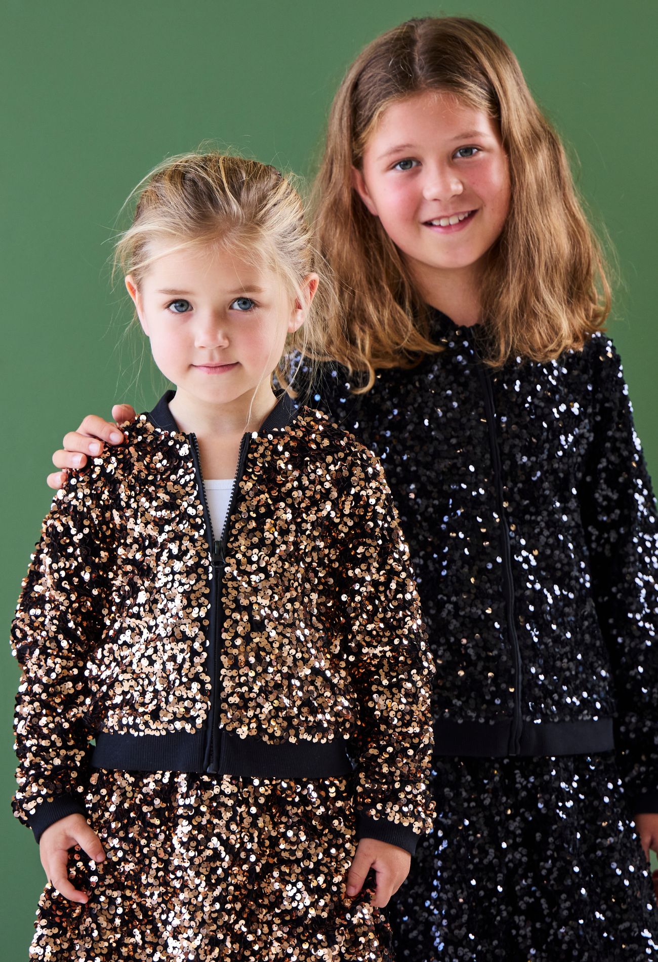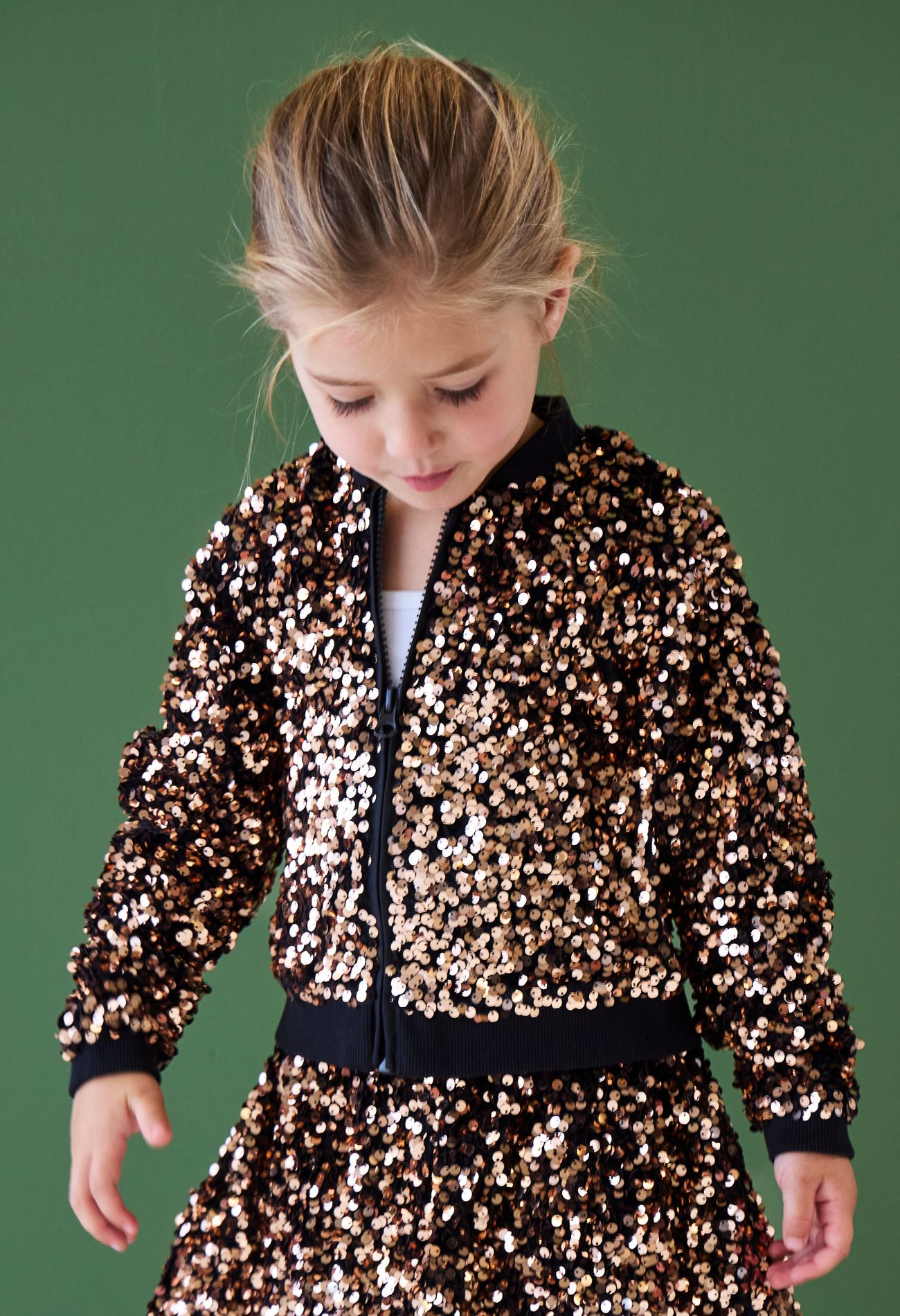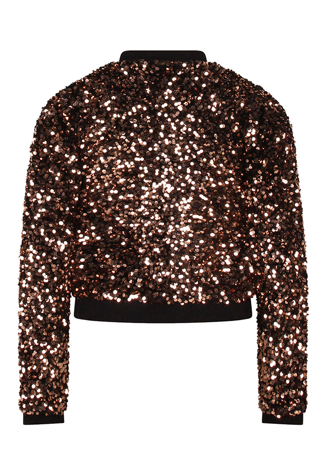 Dit bomberjack voor meisjes is gemaakt van een zachte velvet stof die rijkelijk is versierd met pailletten, perfect voor een feestelijke look. Het jack heeft een sportieve pasvorm met geribde boorden en een ritssluiting aan de voorkant. Combineer met het bijpassende rokje (W10514) voor een complete, sprankelende outfit.