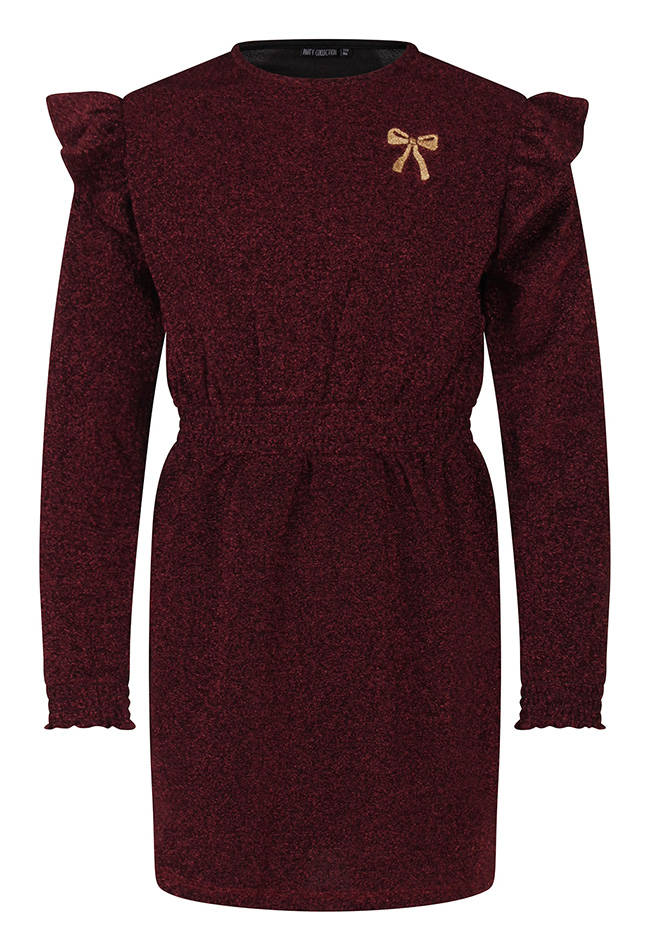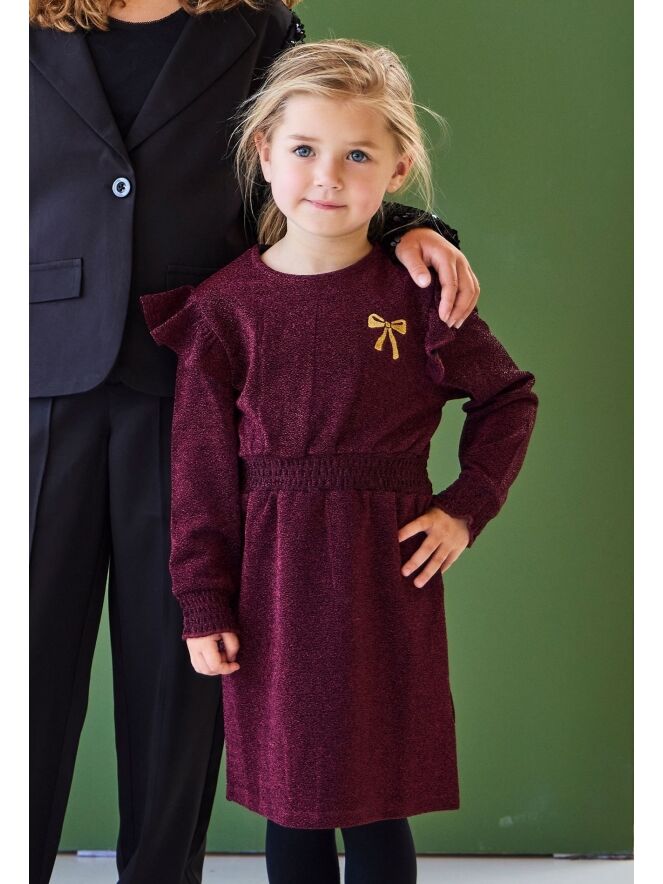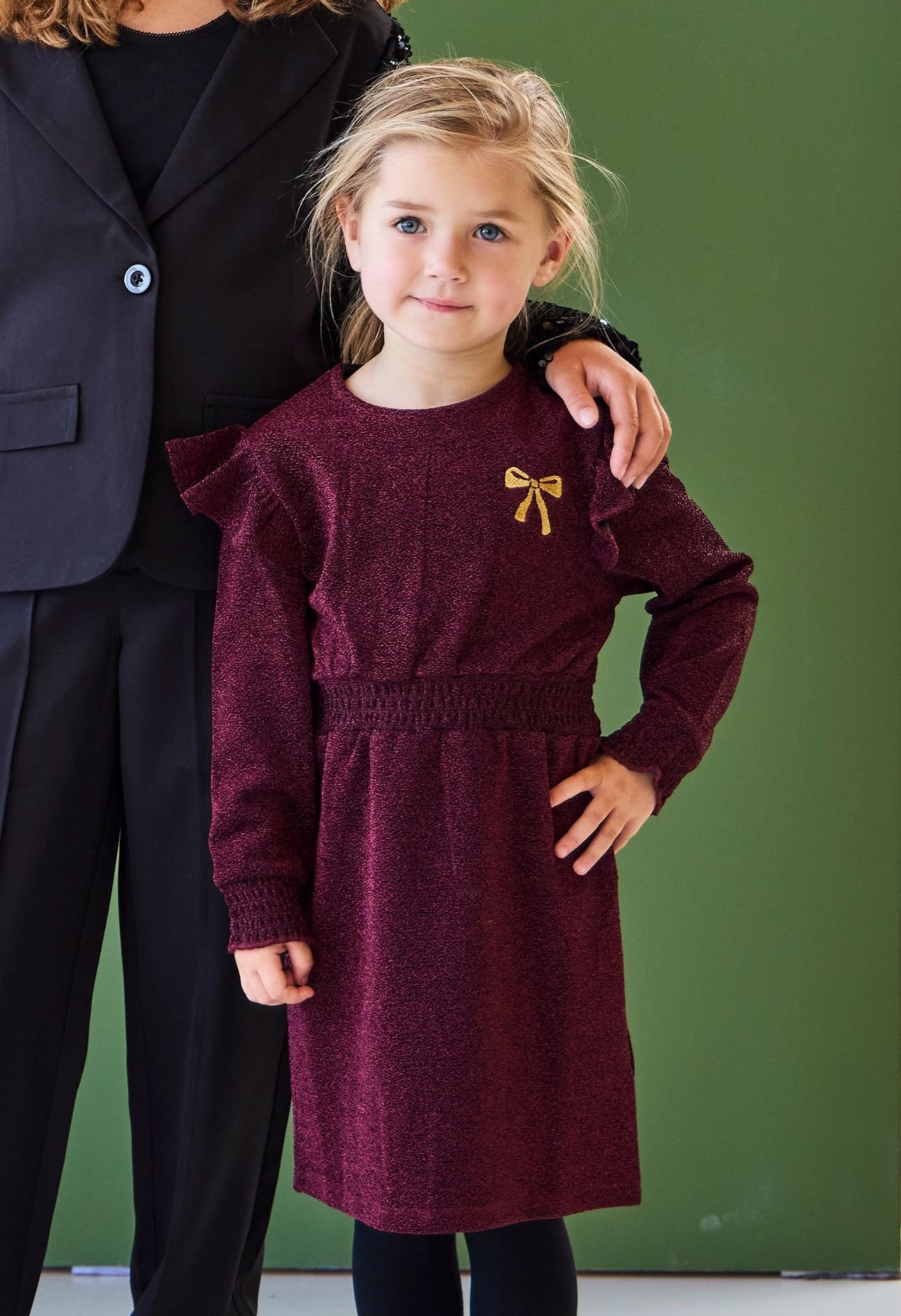 Deze meisjesjurk heeft een subtiele glans door de metallic draad in de stof. De ruches en het strikborduursel geven de jurk een lieve, feestelijke uitstraling. Dankzij het smockdetail sluit hij mooi aan en zit hij comfortabel. Perfect voor een speciale gelegenheid of een dag waarop ze extra wil stralen.