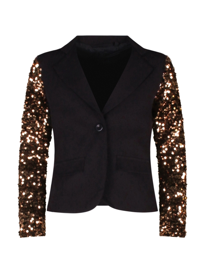 Deze oversized blazer voor meisjes heeft een klassieke reverskraag en mouwen versierd met glinsterende pailletten voor een feestelijke twist. De relaxte pasvorm geeft een trendy look en zit extra comfortabel. Perfect te combineren met het bijpassende rokje of een basic top voor een stijlvolle party outfit.