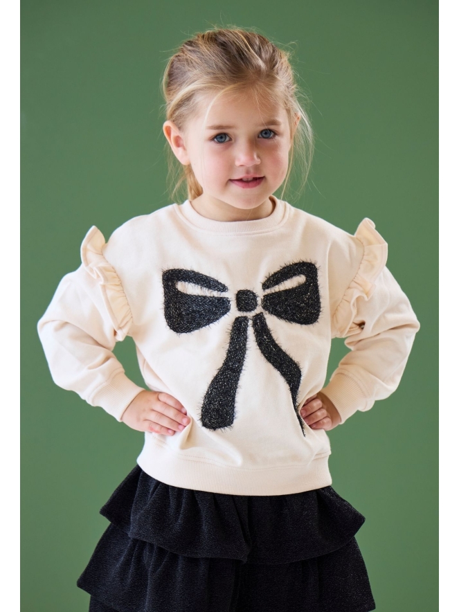 Deze meisjes sweater heeft een speelse glitterstrik en schattige ruches voor een girly touch. Het zachte materiaal maakt hem super comfortabel, terwijl de glitterdetails de outfit een feestelijke uitstraling geven. Leuk te combineren met een pantalon voor een casual look of met een van de rokjes uit de party collectie voor een complete, party outfit.