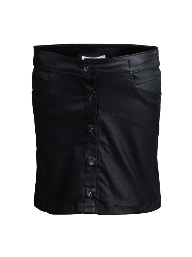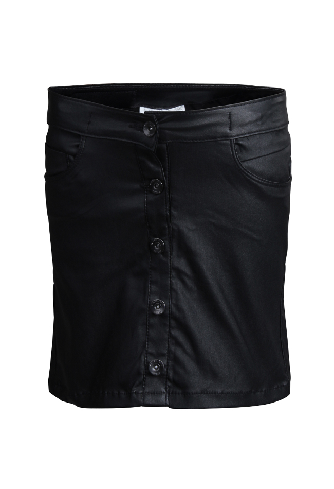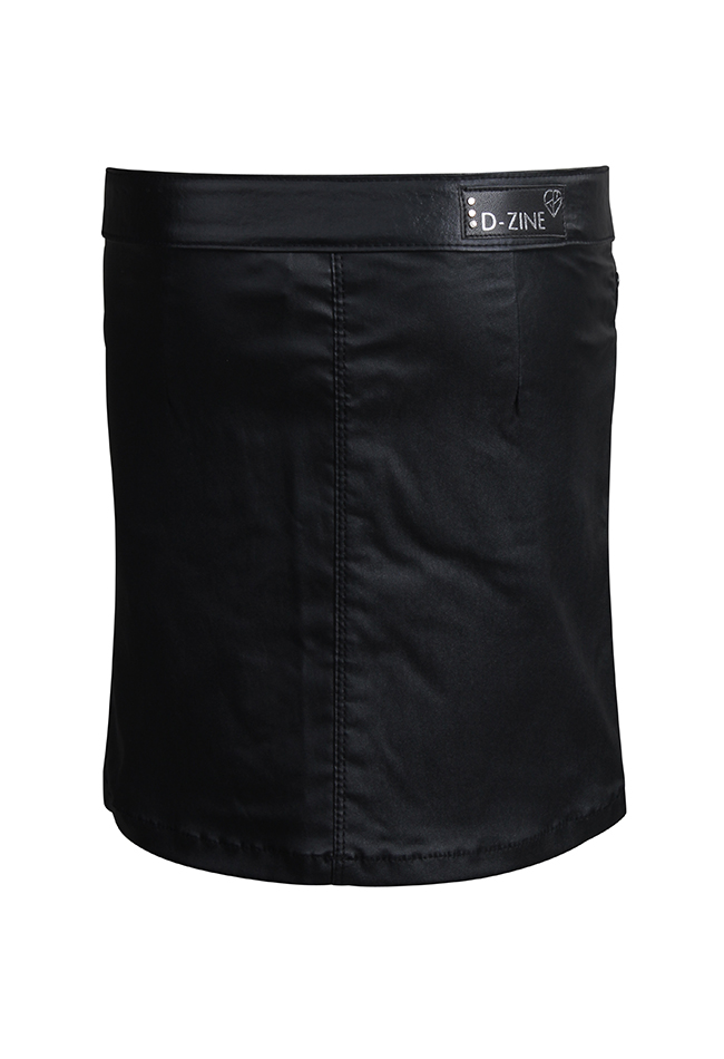 Coated a line rokje van D-zine. Het rokje heeft een coating waardoor het wat leerachtig aanvoelt. Er lopen knopen langs de voorkant, alleen de bovenste twee werken, dit zijn schuifknopen. We hebben dit rokje in 2 kleuren. Materiaal: 75% viscose, 21% nylon, 4% elasthan. Wasvoorschrift: wassen op 40 graden met gelijke kleuren, niet in de droger, niet stijken.