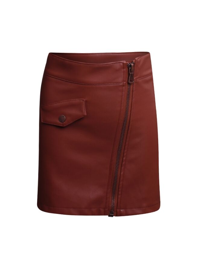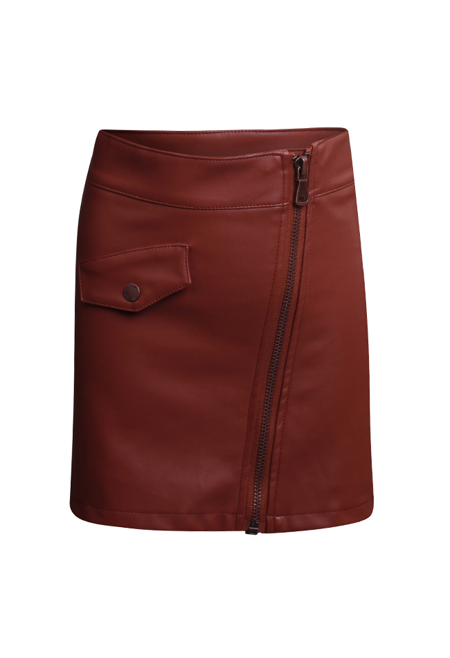 Dit rokje heeft een leder look. Met een rechte a-line vorm en een rits over de gehele voorkant. Er zit een nep klepzakje op.