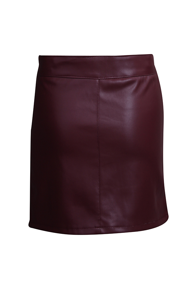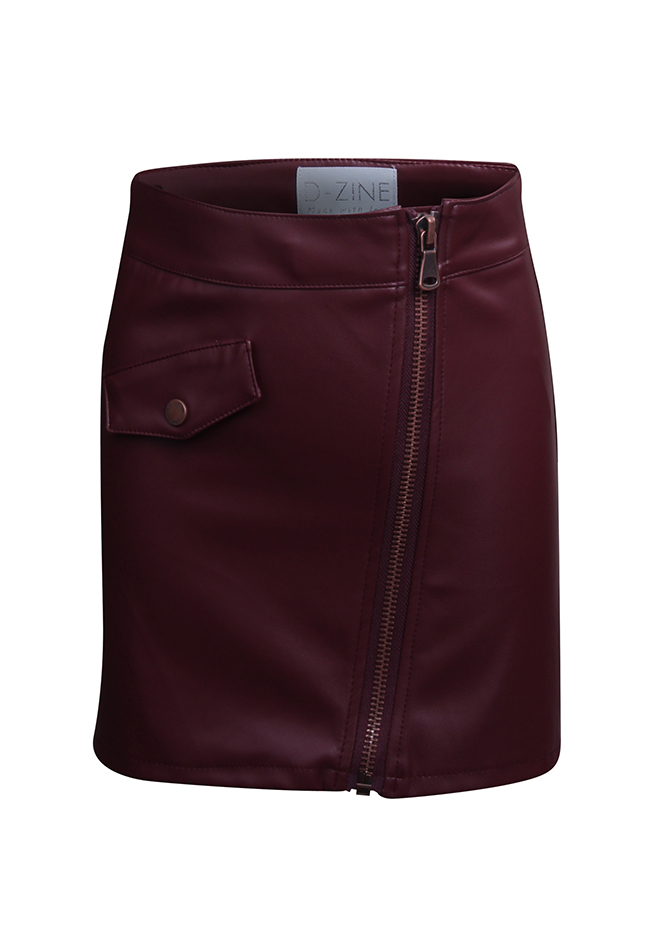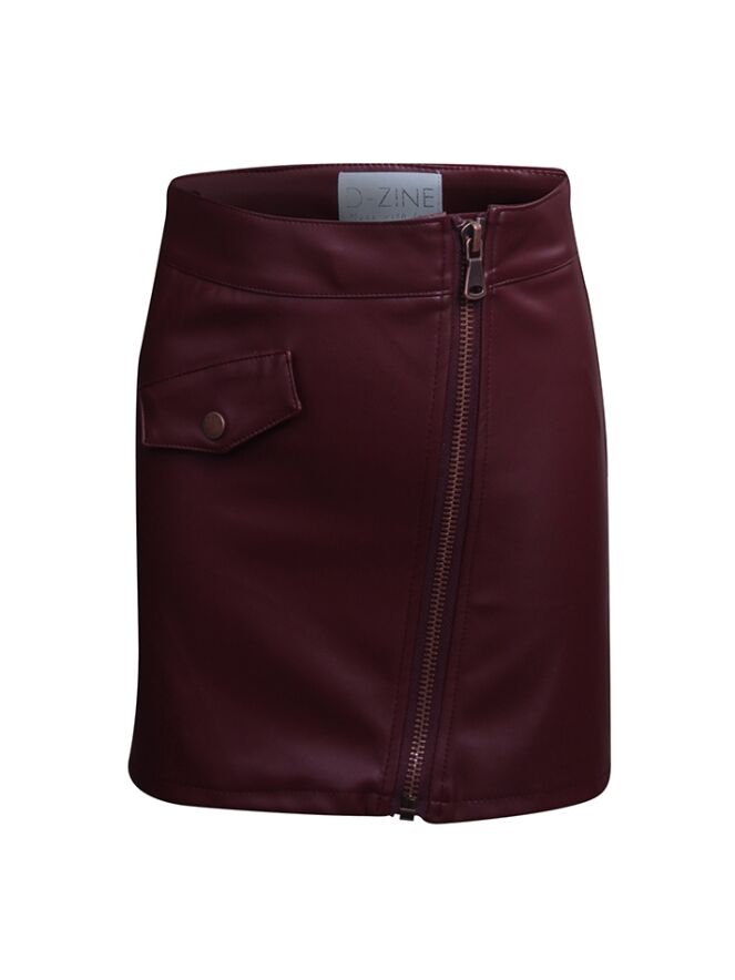 Dit rokje heeft een leder look. Met een rechte a-line vorm en een rits over de gehele voorkant. Er zit een nep klepzakje op.