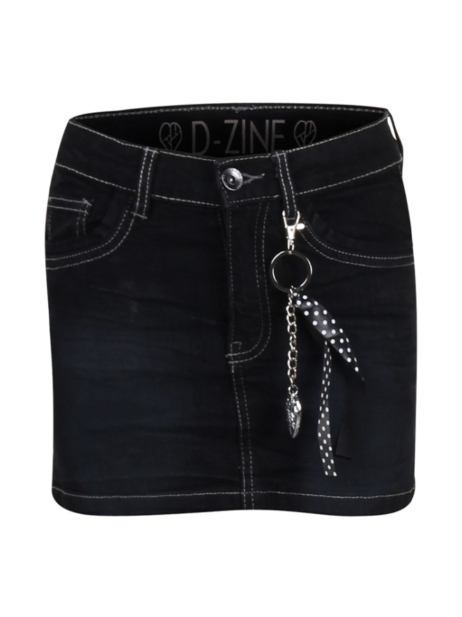 Denim rokje van D-zine. Het rokje heeft een rechte vorm en heeft een hartjes sleutelhanger.