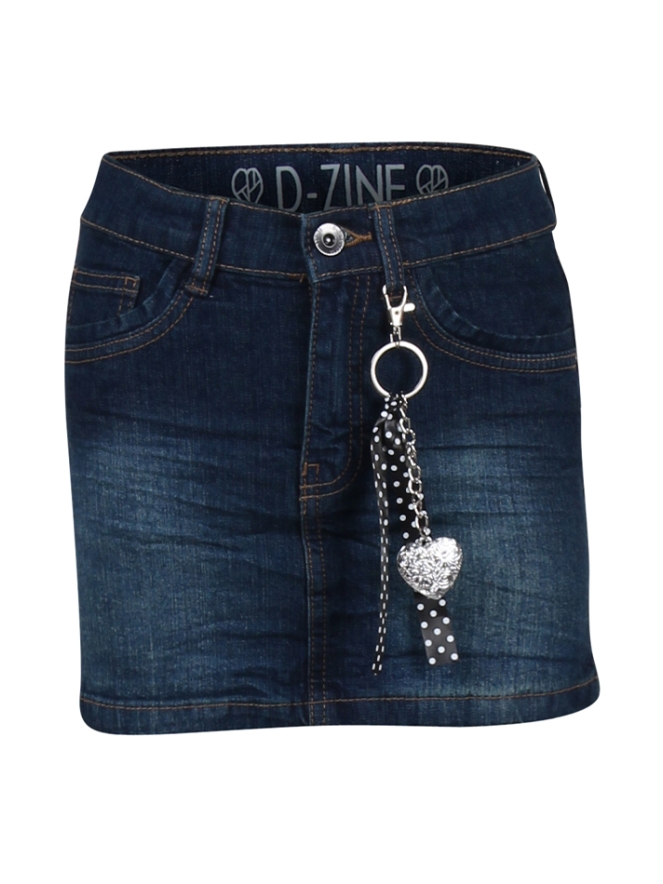 Denim rokje van D-zine. Het rokje heeft een rechte vorm en heeft een hartjes sleutelhanger.