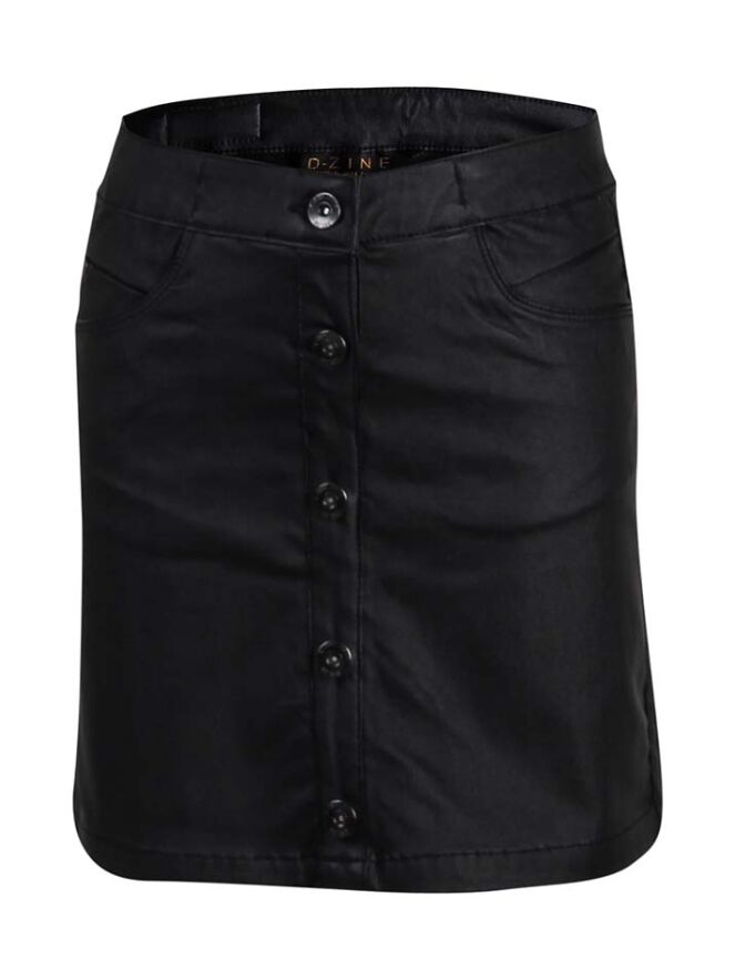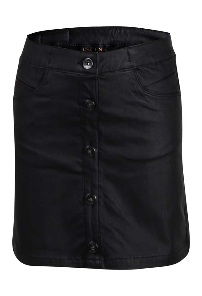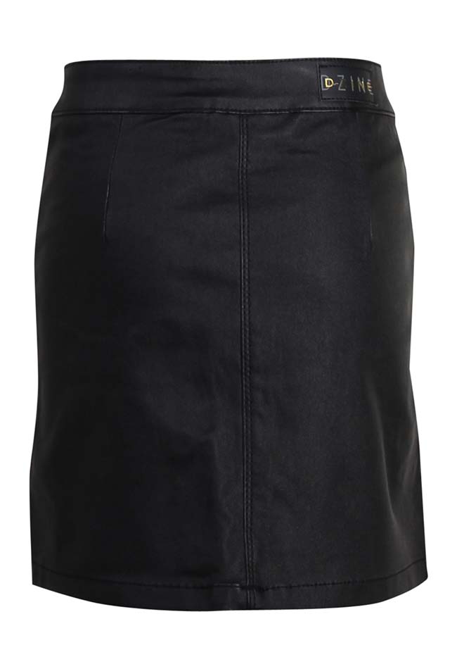 A -line rokje van D-zine. Het rokje heeft sier knopen op de voorkant. Het rokje is van coated stof en heeft een wat leren look. Materiaal: 75% viscose, 21% polyester, 4% elsathan