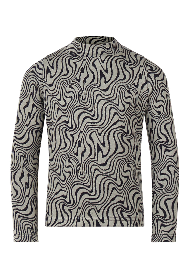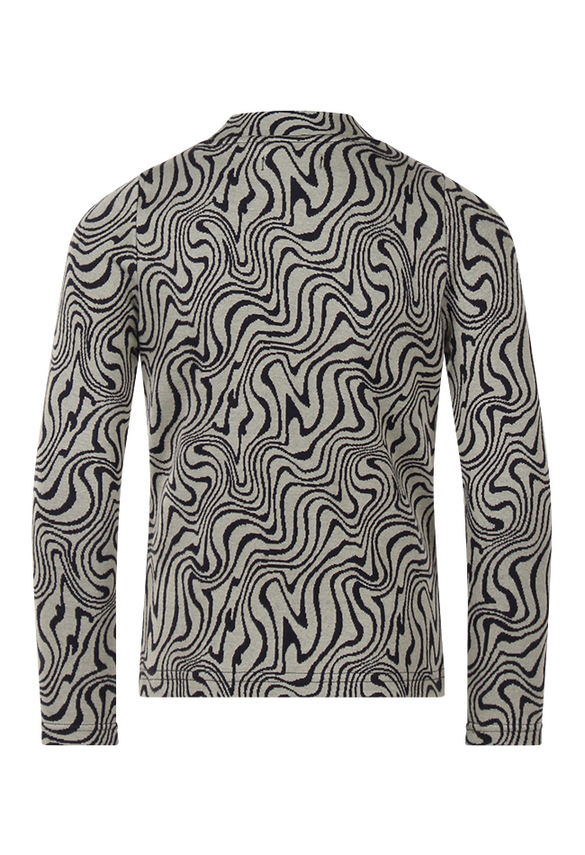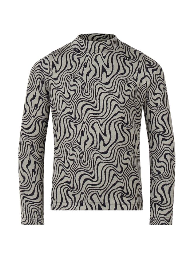 Trui van D-zine. De trui heeft een marble print en een turtle nek. Materiaal: 85% katoen, 10% polyester, 5% elasthan. Wassen op 30 graden, niet bleken, niet in de droger, kan gestreken worden.