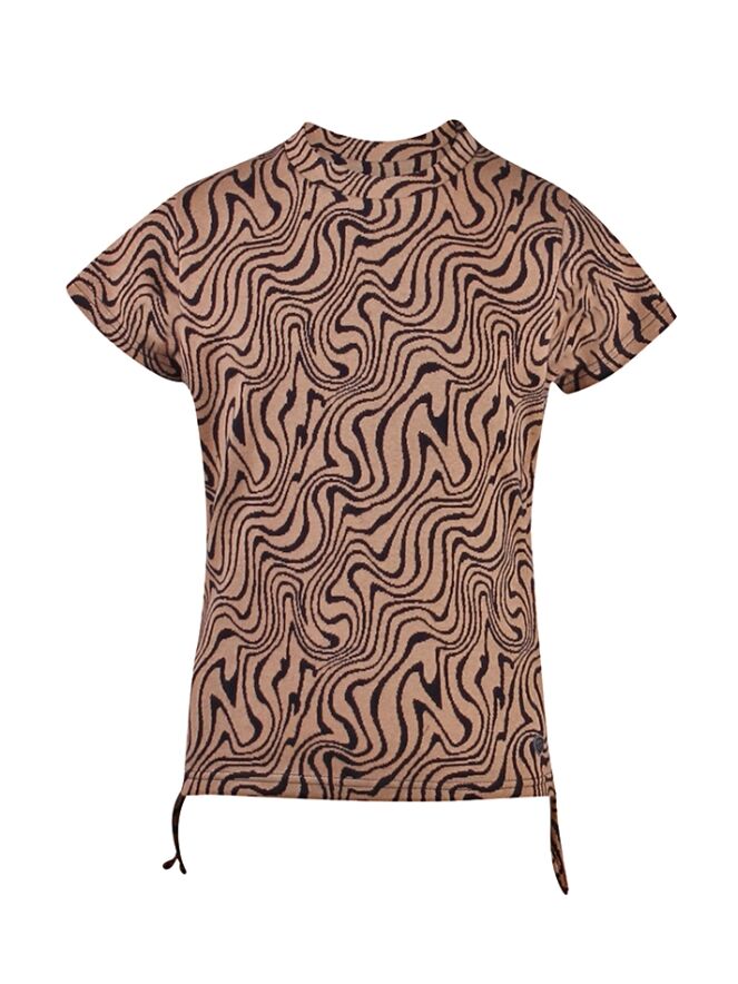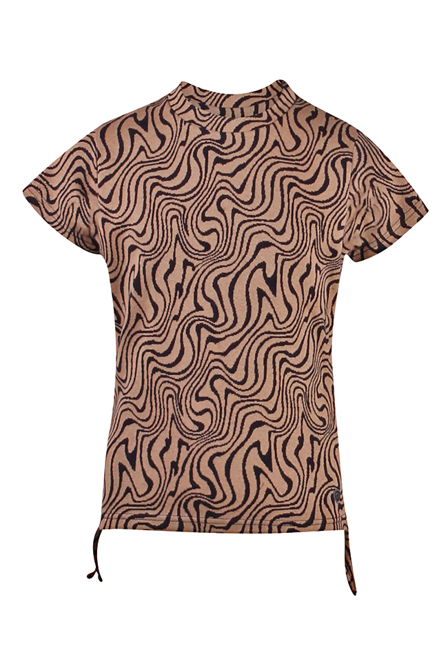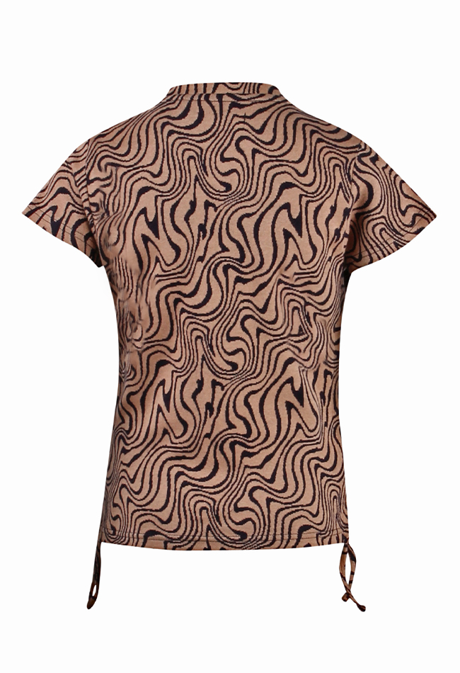 T-shirt van D-zine. Het t-shirt heeft een marble print en aantrek koordjes in de zijkanten om het t-shirt cropped te maken. Materiaal: 85% katoen, 10% polyester, 5% elasthan. Wassen op 30 graden, niet bleken, niet in de droger, kan gestreken worden.