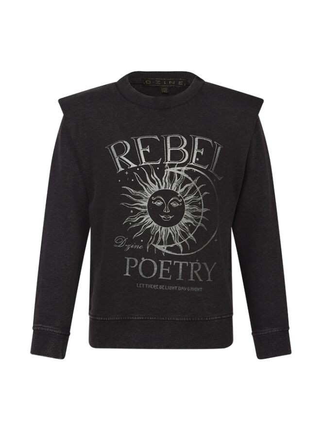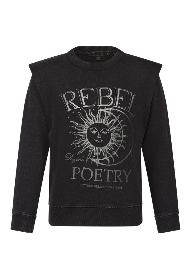 Trui van D-zine. De trui heeft een acid wash/verwassen look met een print op de voorkant. Valt iets oversized. Materiaal: 95% katoen, 5% lycra. Wassen op 30 graden, niet bleken, niet in de droger, kan gestreken worden.