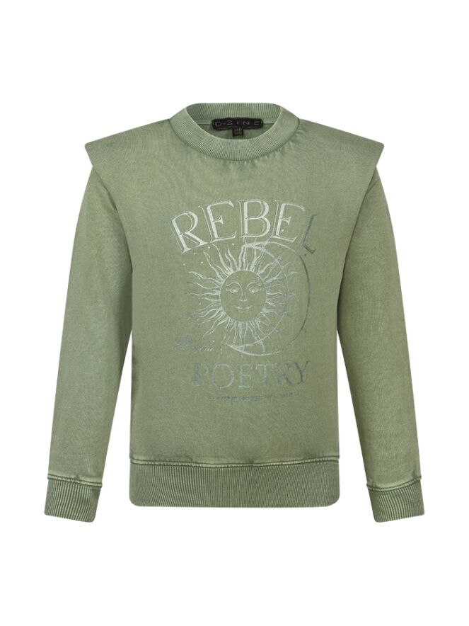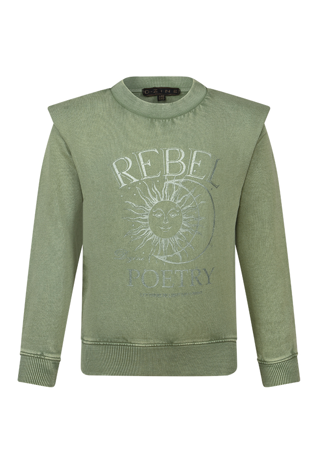 Trui van D-zine. De trui heeft een acid wash/verwassen look met een print op de voorkant. Valt iets oversized. Materiaal: 95% katoen, 5% lycra. Wassen op 30 graden, niet bleken, niet in de droger, kan gestreken worden.