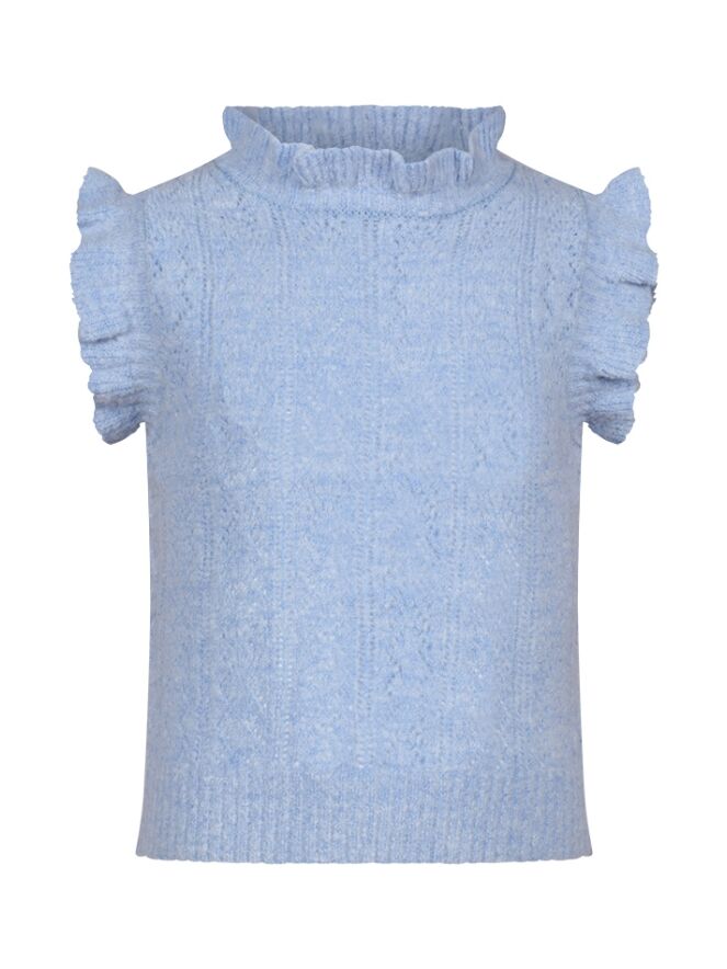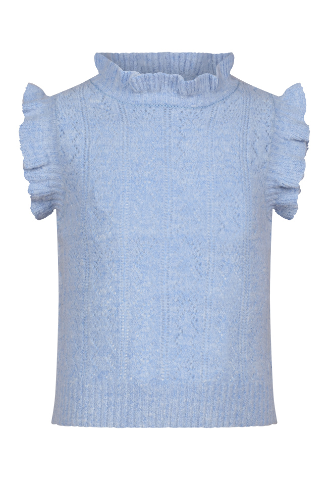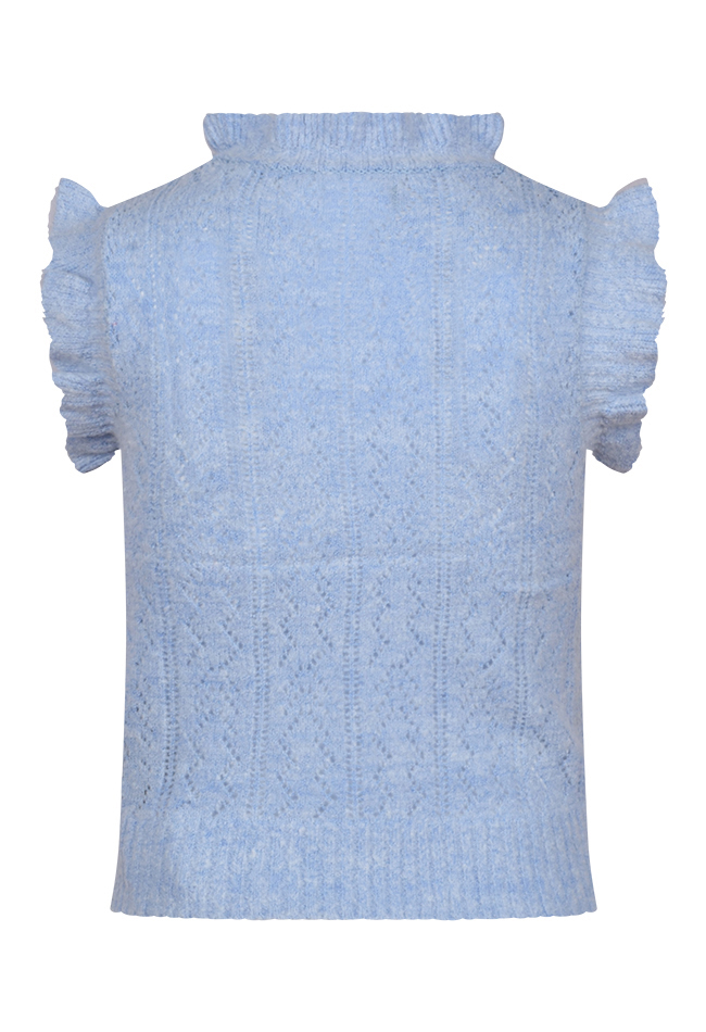 Spencer van D-zine. De spencer heeft een ajour patroon en ruche kraag en mouwen. Materiaal: 79% acrylic, 21% polyester. Wassen op 30 graden, niet bleken, niet in de droger, niet strijken.