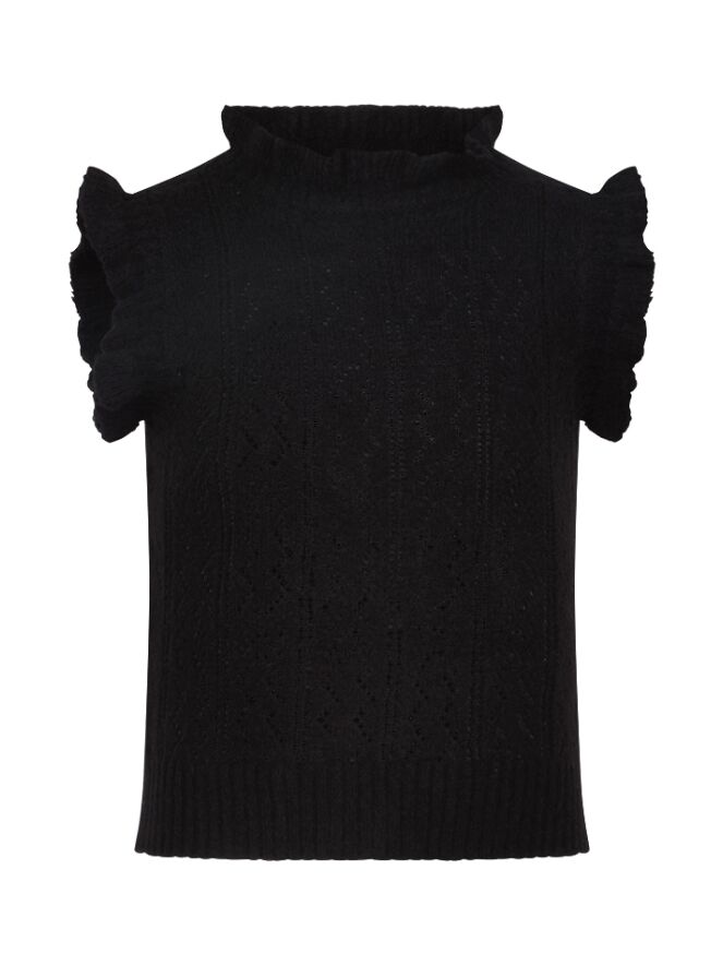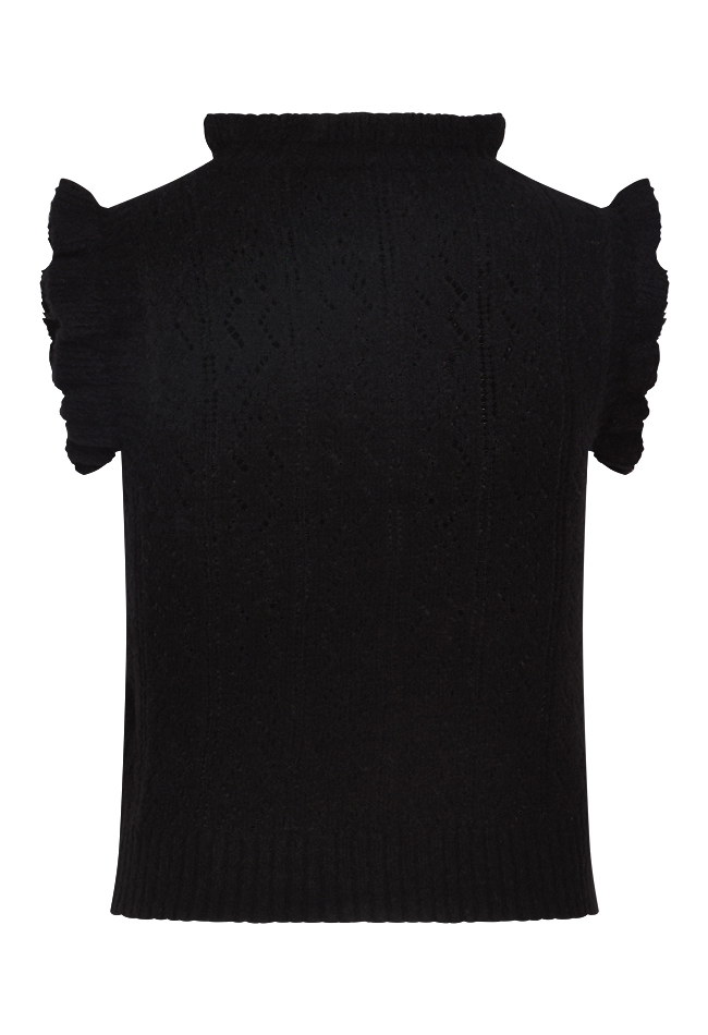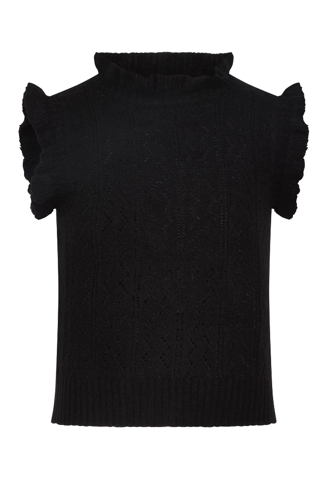 Spencer van D-zine. De spencer heeft een ajour patroon en ruche kraag en mouwen. Materiaal: 79% acrylic, 21% polyester. Wassen op 30 graden, niet bleken, niet in de droger, niet strijken.