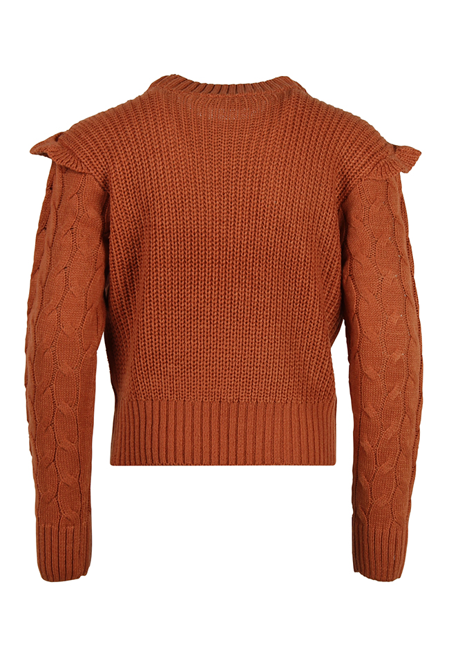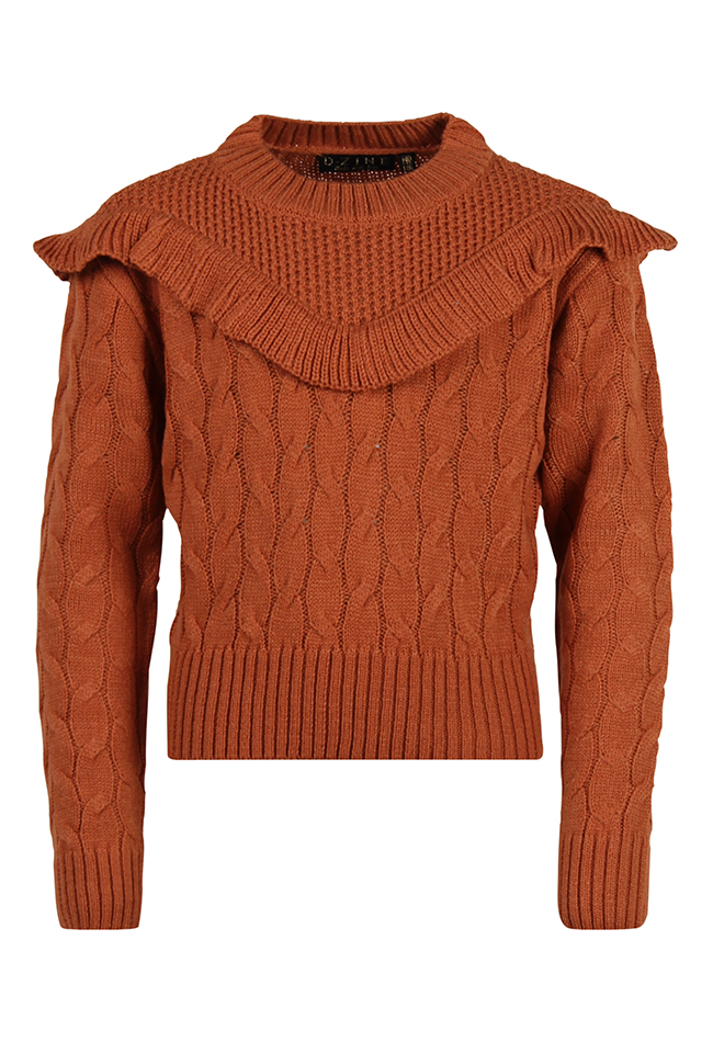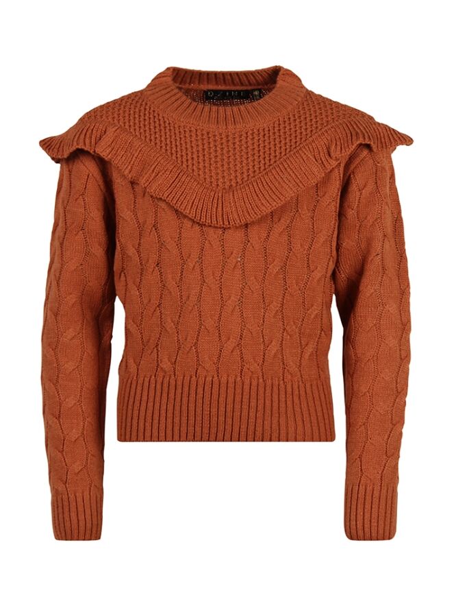Kabelbrei trui van D-zine. De trui heeft een kabelbrei patroon en een ruche op de voorkant. Valt iets oversized. Materiaal: 100% acrylic. Wassen op 30 graden, niet bleken, niet in de droger, niet strijken.