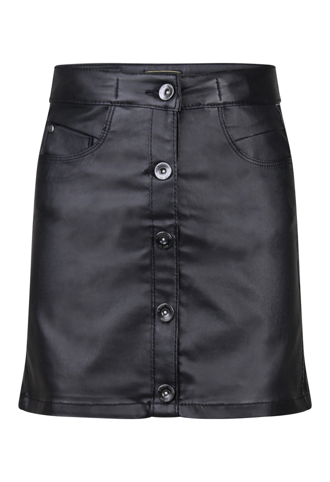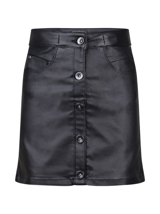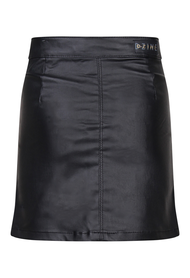 Zwarte leather look rok. Met 1 knoop en 1 haak sluiting aan de voorzijde. Tailleband is verstelbaar met knoop en elastiek.